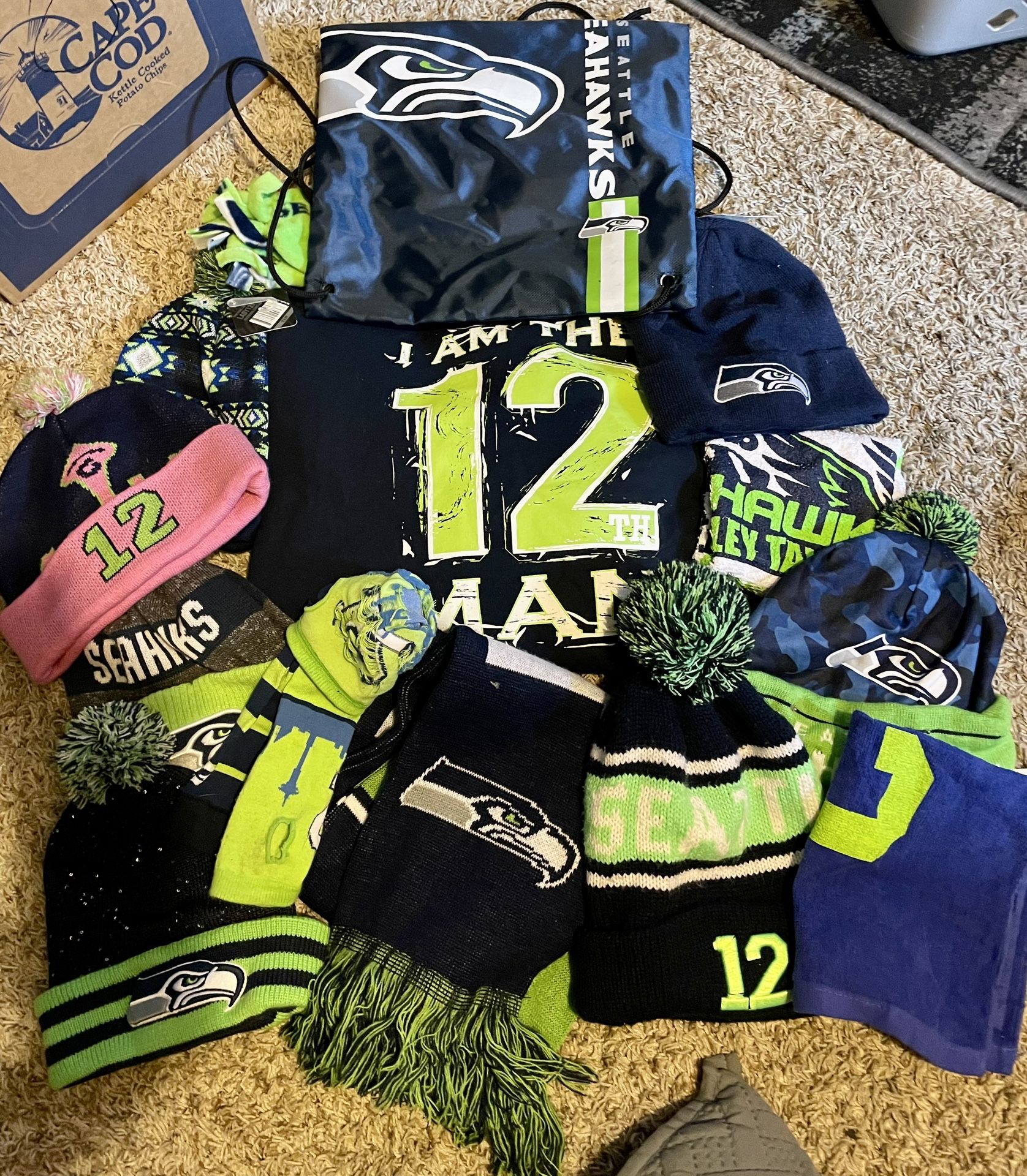 Beanies, scarves, bag, hand towels, sweater Some new with tags