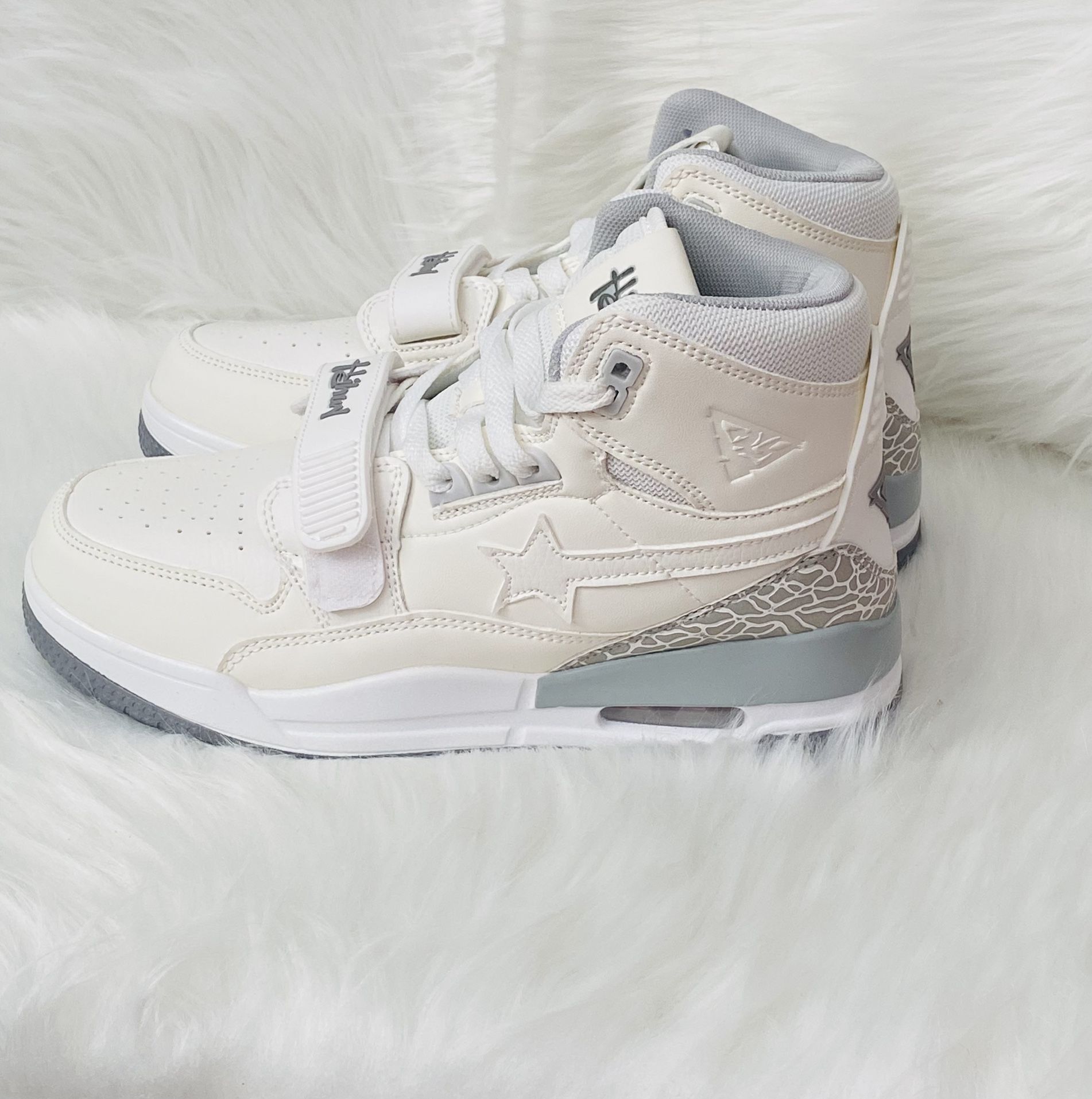 Step up your sneaker game with these stylish white high-top streetwear sneakers. They feature a clean white and grey colorway, strap detail, and star logo accents, giving them a premium, sporty look inspired by classic basketball designs. Details: • Condition: New with box • Color: White / Light Grey • Style: High Top / Basketball / Streetwear • Features: Adjustable strap, padded ankle, air-cushioned sole, and stylish detailing • Unisex design – perfect for men or women • Great for casual outfits, streetwear looks, or everyday wear 🔥 Trendy, comfortable, and eye-catching sneakers at a great value!