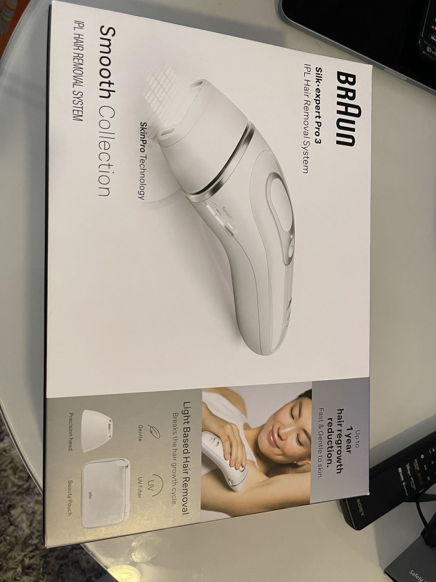 Highlights Long-lasting, visible hair reduction in just 3 uses*. Fast, precise & gentle on skin! INCLUDES: Pro3 Device in white/silver, a standard cap, precision cap, and zip pouch SALON-LIKE TECHNOLOGY, FOR A FRACTION OF THE COST: Salon laser hair removal alternative using advanced IPL (Intense Pulsed Light) technology so you can get up to 1 year of smooth skin from home AUTOMATICALLY ADAPTS PERFORMANCE TO YOUR SKIN TONE AND BODY PART: Optimal power for every body part with Skin Pro -salon-like technology that automatically and continuously adapts to your skin tone HEAD TO TOE TREATMENT: The ideal tool for women to safely use on upper lip, chin, underarms, legs, stomach, arms, and intimate area while men can tackle head to toe hair removal on the chest, back, arms, stomach, pubic, and legs 2 SENSITIVE MODES: at the touch of a button, switch between modes (normal and gentle). Use sensitive skin mode for a virtually pain-free session, ideal for first-time users FAST & EASY: flashes up to 100 times per minute for an effortless treatment & better skin coverage for less missed spots SAVE MONEY: save thousands vs. expensive salon hair removal appointments!!!!! For anymore questions please message me thank you