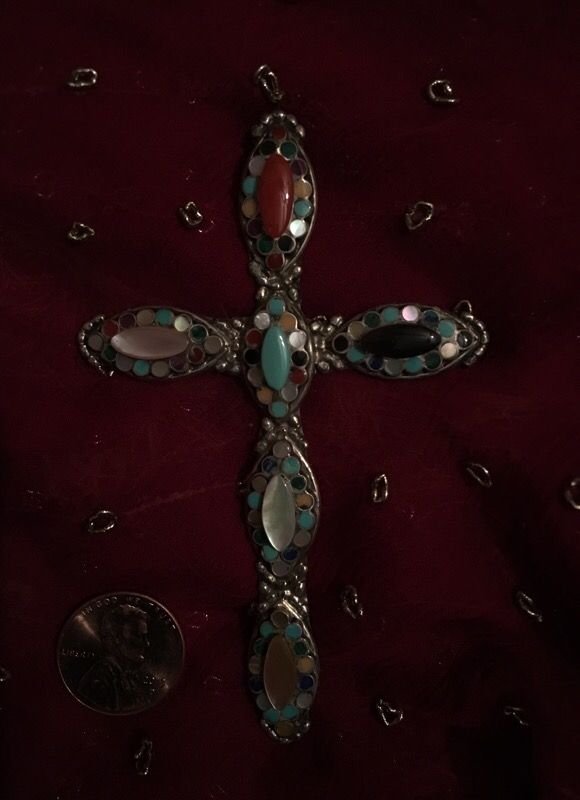Mexican vintage silver pendant cross turquoise coral mop onyx carnelian hand-crafted