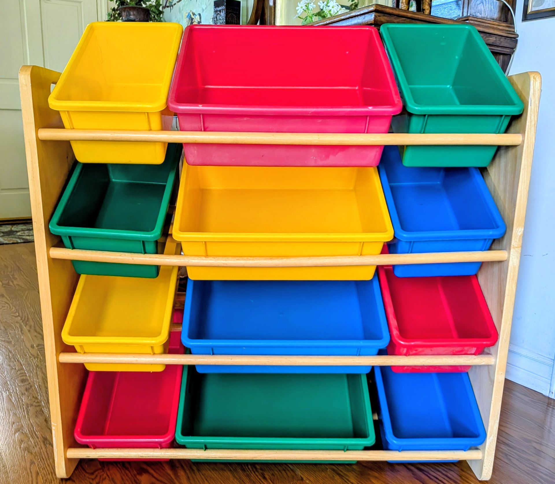 Toy storage organizer with 12 plastic multicolor bins, natural wood , for bedroom and playroom 33.6 in wide by 10.9 in deep* 3 ft high. Great for easy pickup of toys. Listed on Amazon for $52.60 and they are out of stock