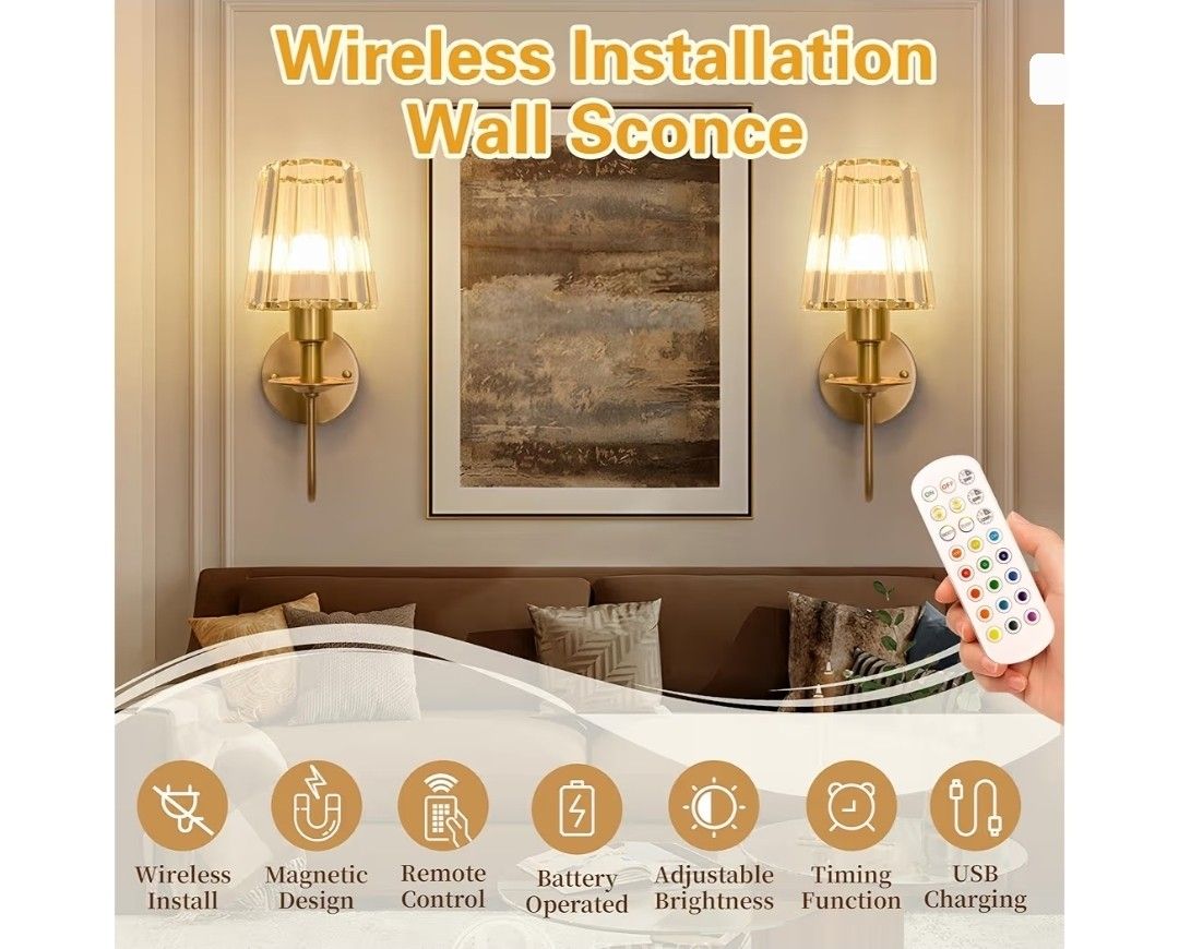 Battery Operated Wall Sconces Set of 2 – 5200mAh Rechargeable Gold Crystal Glass, 15 Colors & 10-Level Dimmable, Wireless Wall Lights for Living Room