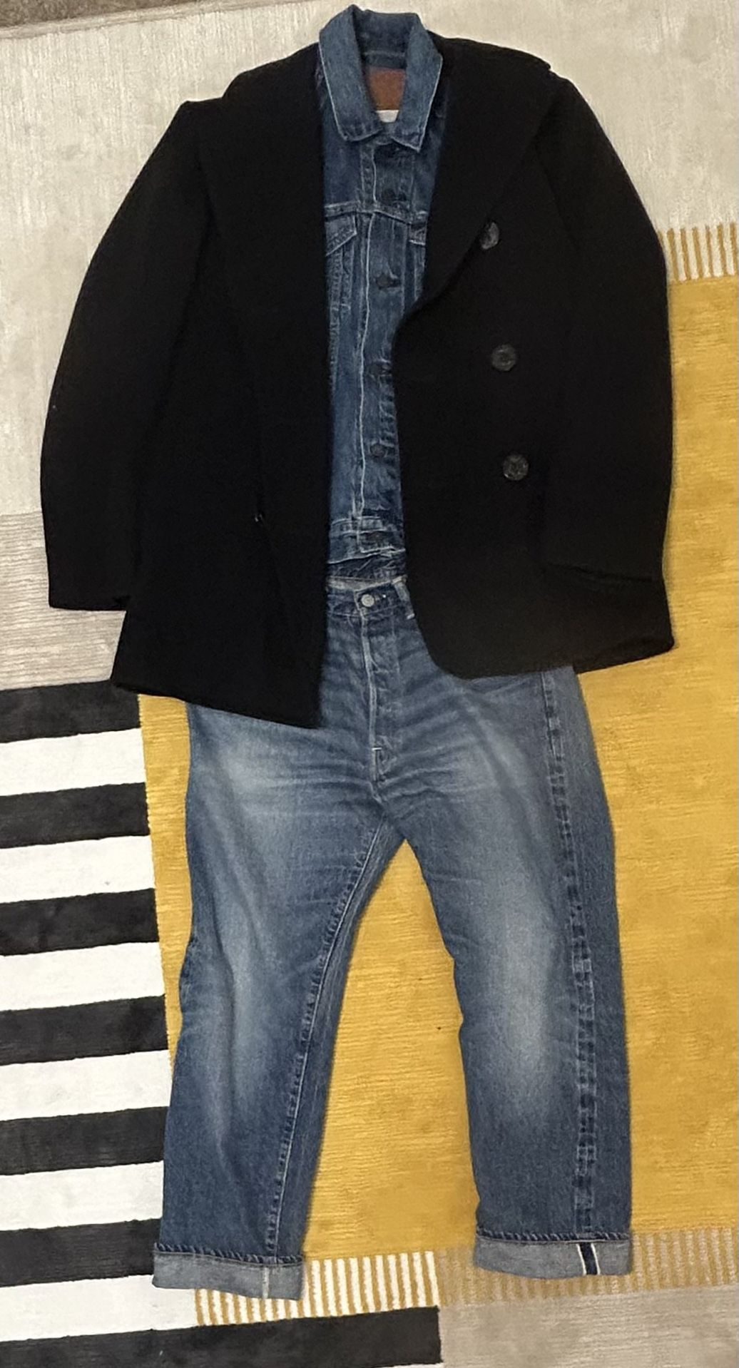 Vintage peacoat U.S navy 1940 In great shape for its age Heavy duty wool 38R (medium) $80 Levi’s premium type 3 trucker jacket $50 Warehouse & co. Selvedge jeans 33x27 fits like 30 $50