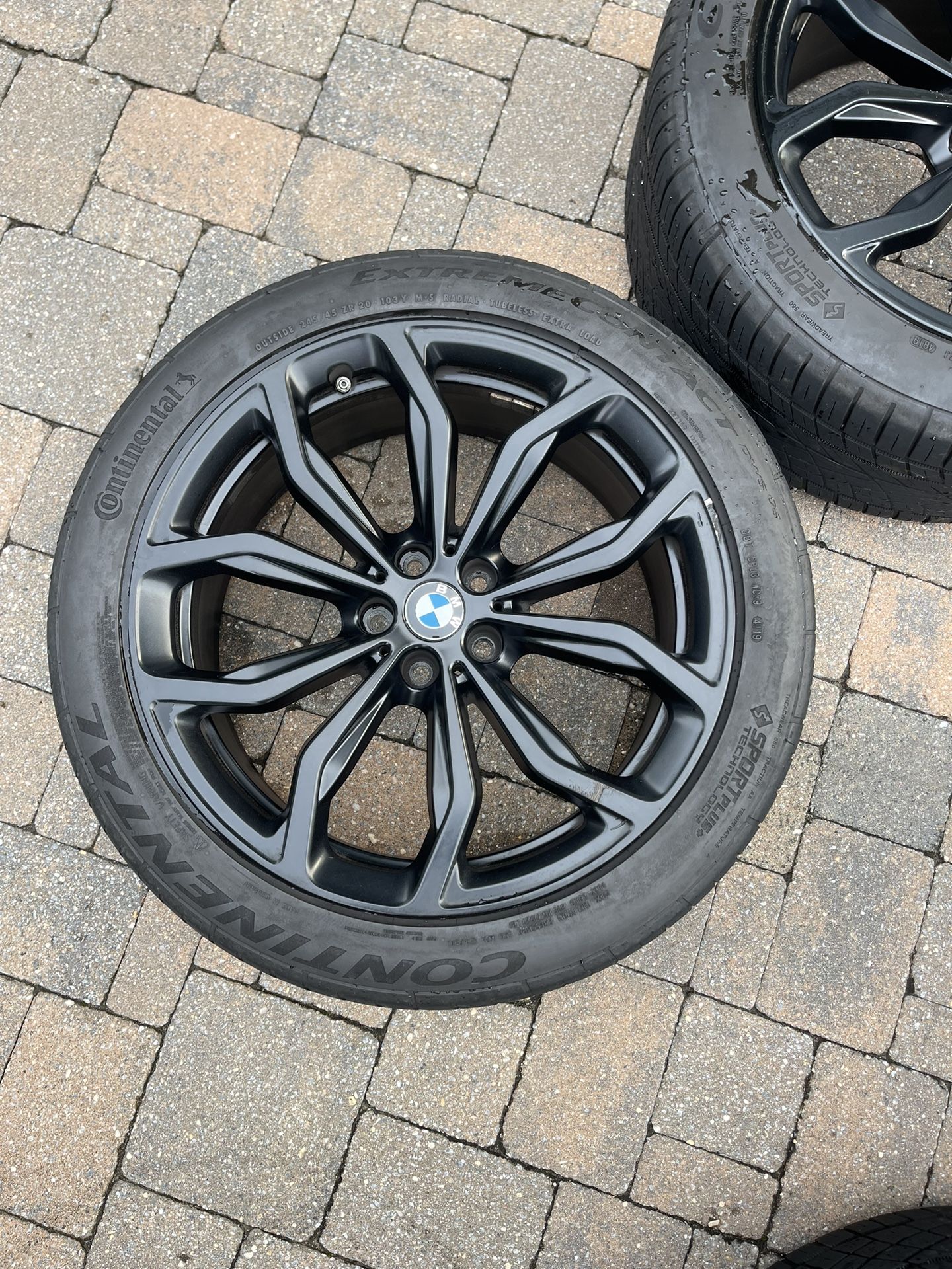 These came off of a X3. BMW OEM staggered style 695 satin black rims 20” in mint condition. Slight curb rash on one front wheel, hard to notice. Front tires have great tread, rear still have some left. Rims are 5x112 bolt pattern. Tires are continental extreme contact. These will fit any bmw will same wheel pattern These also have TPMS Front: 8.5 x 20 Rear 9.5 x 20 Rim Dimensions • Front / Rear: 8x20 ET27 / 9.5x20 ET43