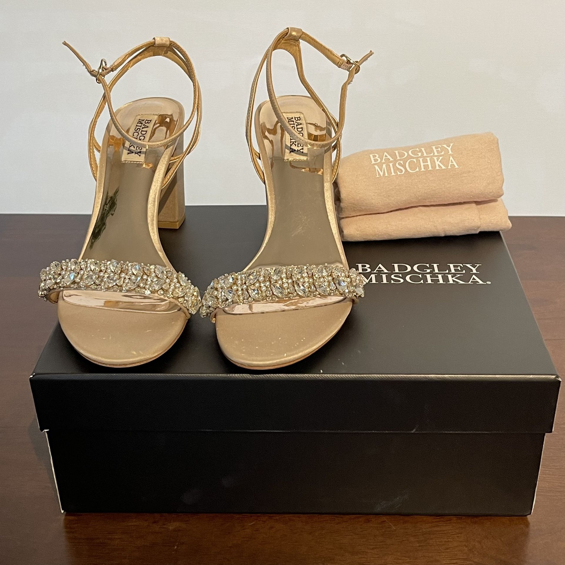 Perfect wedding sandal Used for one event and in great condition Beautiful champagne nude color with rhinestone detail Model ‘NADINE’ in Nude Satin Size 8.5 Badgley Mischka "Nadine" sandals in crystal-embellished satin and glitter fabric 3 in / 75 mm block heel Ankle-wrap strap with adjustable buckle Open toe Leather outsole Lining: Leather Spot clean Imported