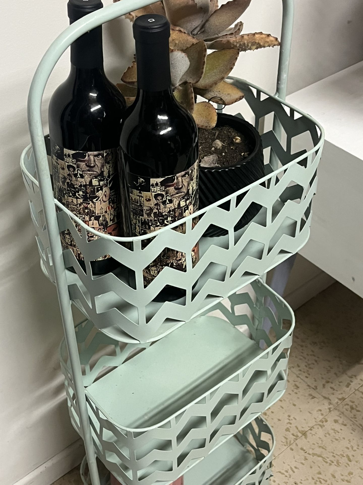 Three tiered metal decor/shelves. Painted a pastel mint color made of metal. Good for indoor outdoor use I put a wine bottle for size comparison, come just the stand Pick up 92117