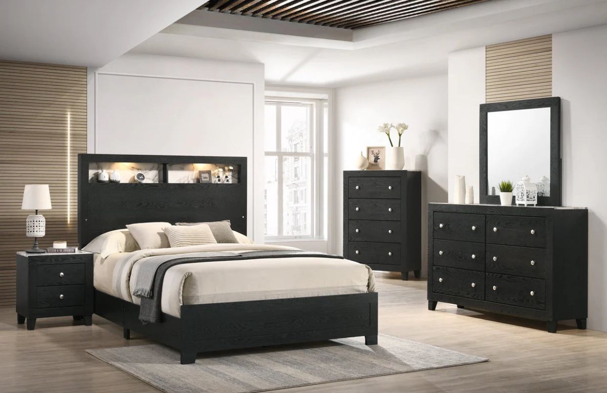 4PCS BEDROOM SET BLACK WITH LED LIGHTS AND WHITE TOP FAUX MARBLE (CR) QUEEN $699 E KING $799 DELIVER AVAILABLE SE HABLA ESPAÑOL Features New Collection Headboard with LED Sleek Sloping Design Extra Storage Space Black Finish Included: 4Pcs queen $699 1 Queen Bed (headboard, footboard, side rails) 1 Night Stand 1 Dresser 1 Mirror Optional: 4Pcs King Size Bed $799 Extra Night Stand $149 Tall Chest $249 Dimensions: Queen Size Bed: 63.7"W x 85"D x 55"H Dresser: 57.3"W X 16.2"D X 37.8" H Mirror: 335.4"W X 1.3"D X 35.4" H Nightstand: 21.5"W X 15.4"D X 22.8" H King Size Bed: 79.7"W x 85"D x 55"H Tall Chest: 31.3"W X 16.2"D X 47.2"H
