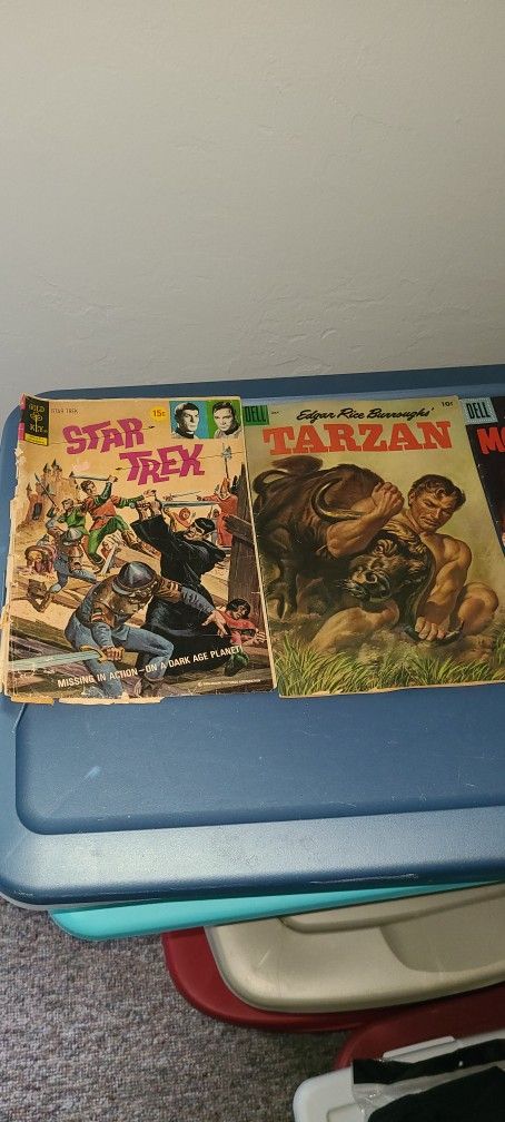 Old comics straight arrow no. 4 1950. Mountain men dell no.11 1957...Tarzan no. 68 1955... star trek no .16. 1972 Make me an offer bbv