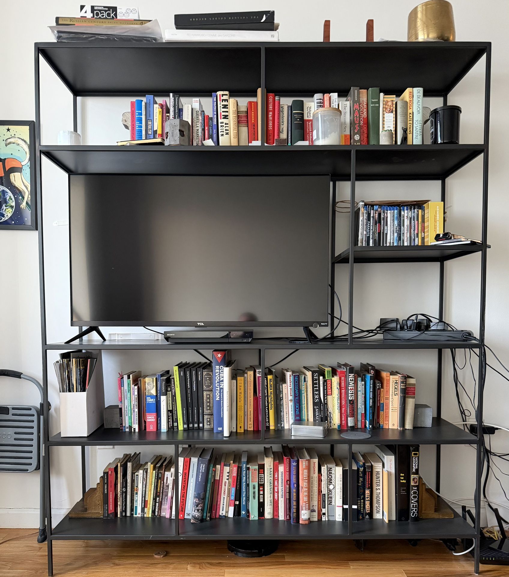 All steel bookshelf and tv stand from room and board. Measurements are 60inches wide 15 deep and 72 tall. The TV pictured is 43 inches for reference. Currently retails new for $1,299