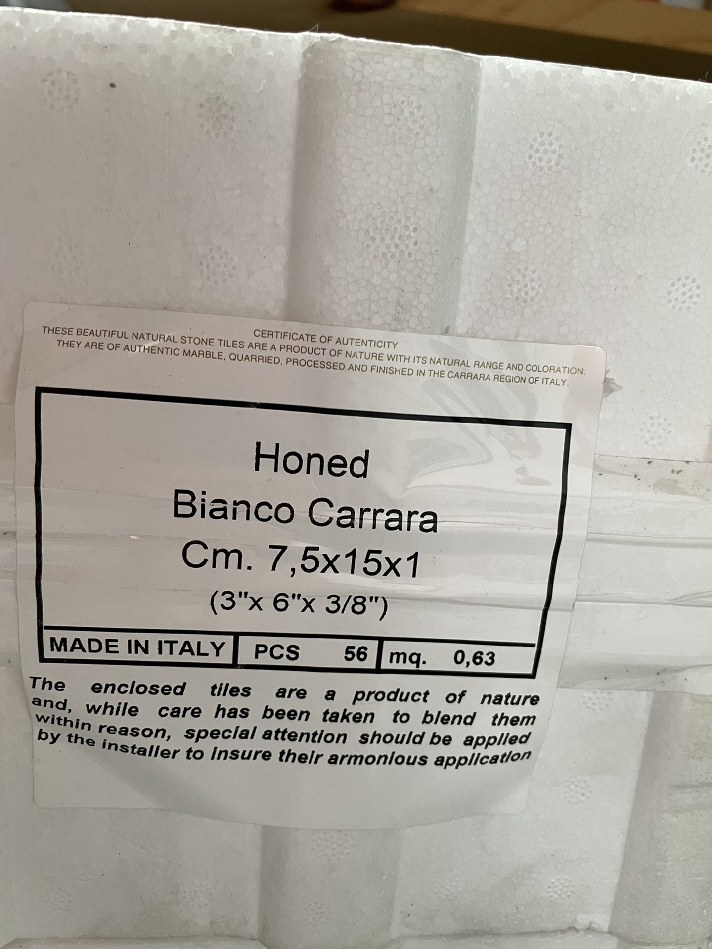 3 box’s of honed Carrara Bianco marble tiles. 3x6