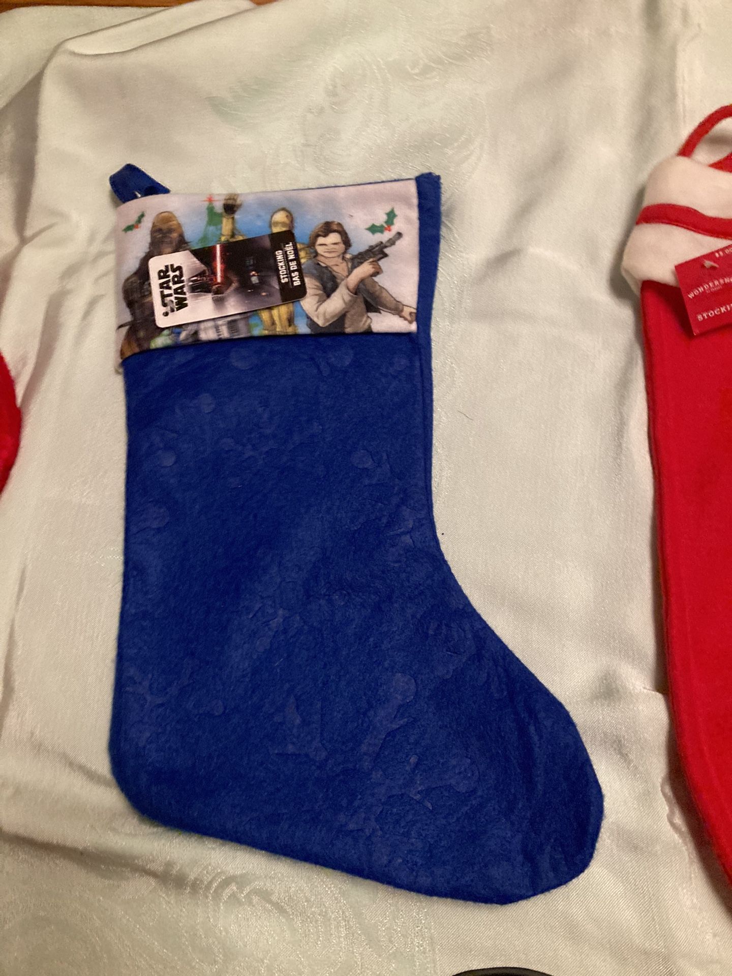 Blue embossed snowflake Christmas stocking with a Star Wars cuff featuring C-3PO, R2-D2, Han Solo and Chewbacca. Great gift for your Star Wars enthusiast. Excellent condition. Asking $3 Pick up in Glendale Heights. Check out my other posts please for more Christmas ornaments, stockings and hats