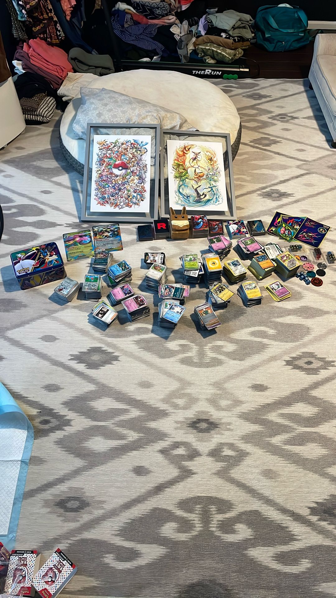 Tons of bulk pokemon cards! A lot of holos, reverses, rare, uncommon, and common (fills entire shoe box). Comes with game coins, dice, pokemon art work, 2 plushies, 3 playing mats, lunch box, stickers, small collection book, and mega cards! Picture frames are included