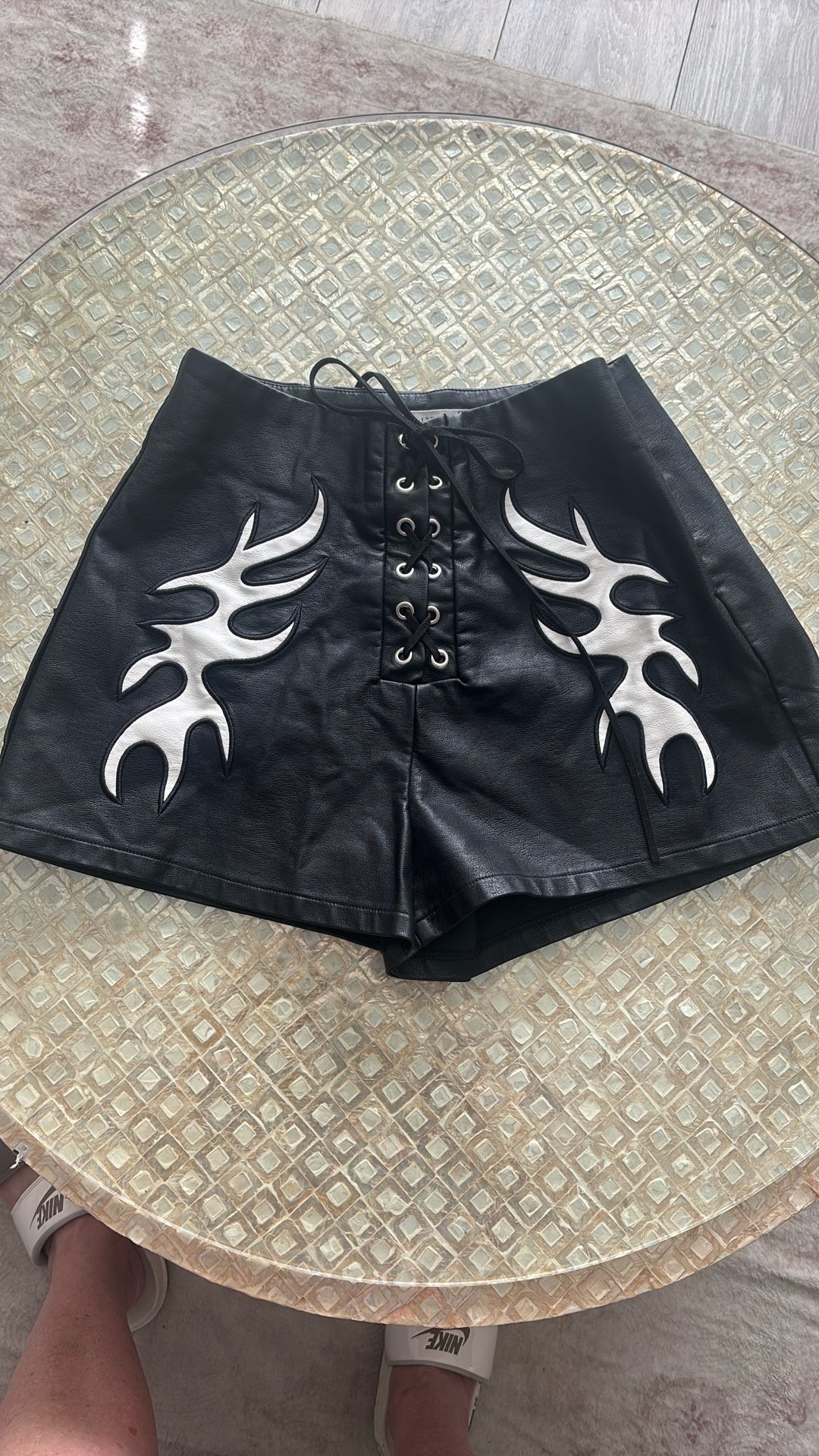 Black vegan Leather Shorts With Cream Color Flames Size Medium. Soft Leather