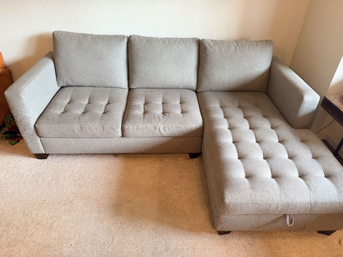 Comfortable light beige sectional sofa with storage chaise in great condition. Perfect for apartments, living rooms, or family spaces. ✔ Spacious L-shaped layout ✔ Large storage compartment under the chaise ✔ Clean neutral color that matches any home ✔ Comfortable cushions and sturdy frame ✔ Professionally cleaned and ready for your home Great for relaxing, movie nights, or extra storage for blankets and pillows. Dimensions: Approx. 8ft x 5ft 🚚 Delivery available in Seattle / Tacoma area Message me if you'd like delivery, measurements, or to schedule pickup.