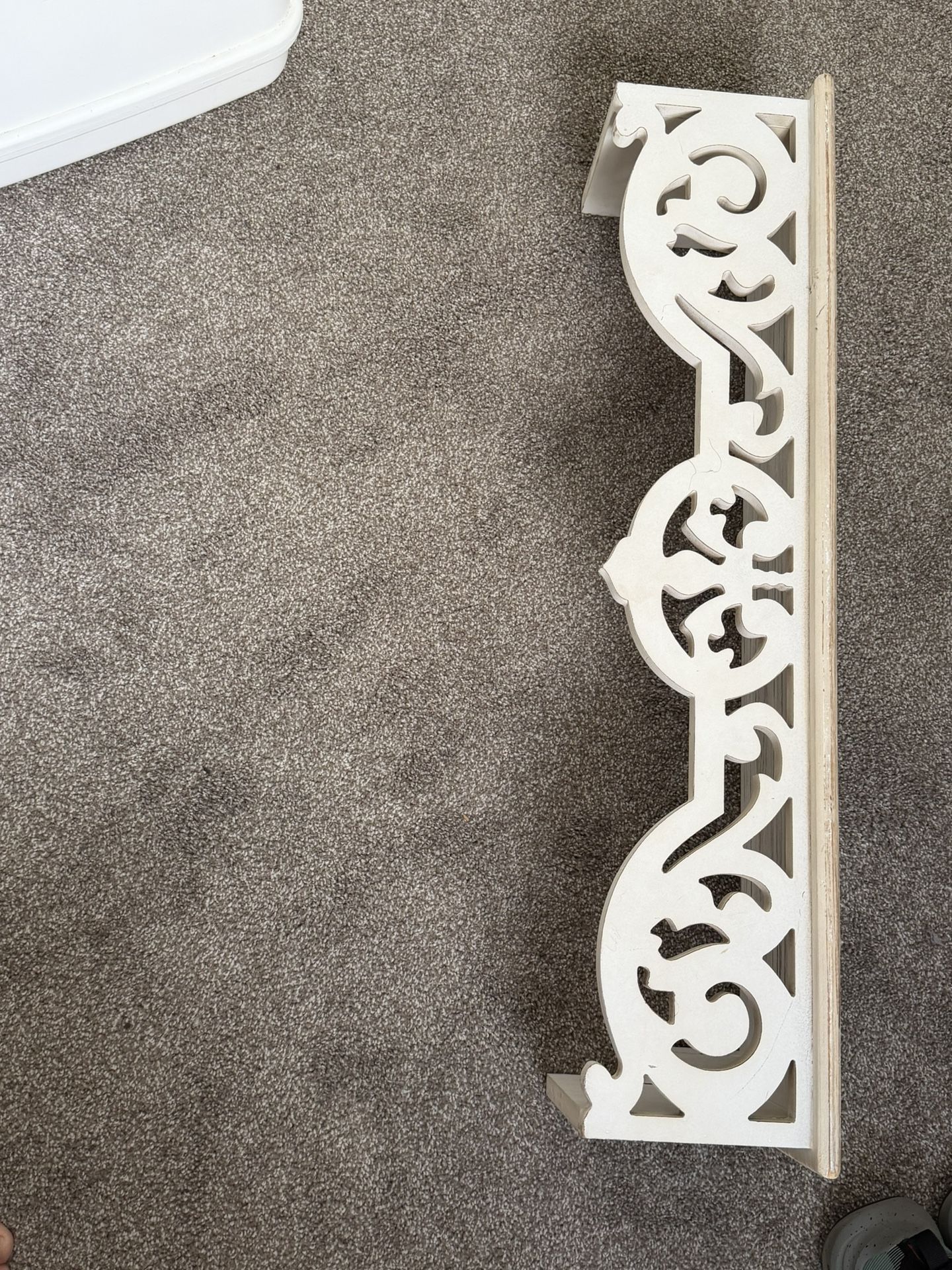 White ornate floating wall shelf with scrollwork design. Boho style. 31 inches long. Wood