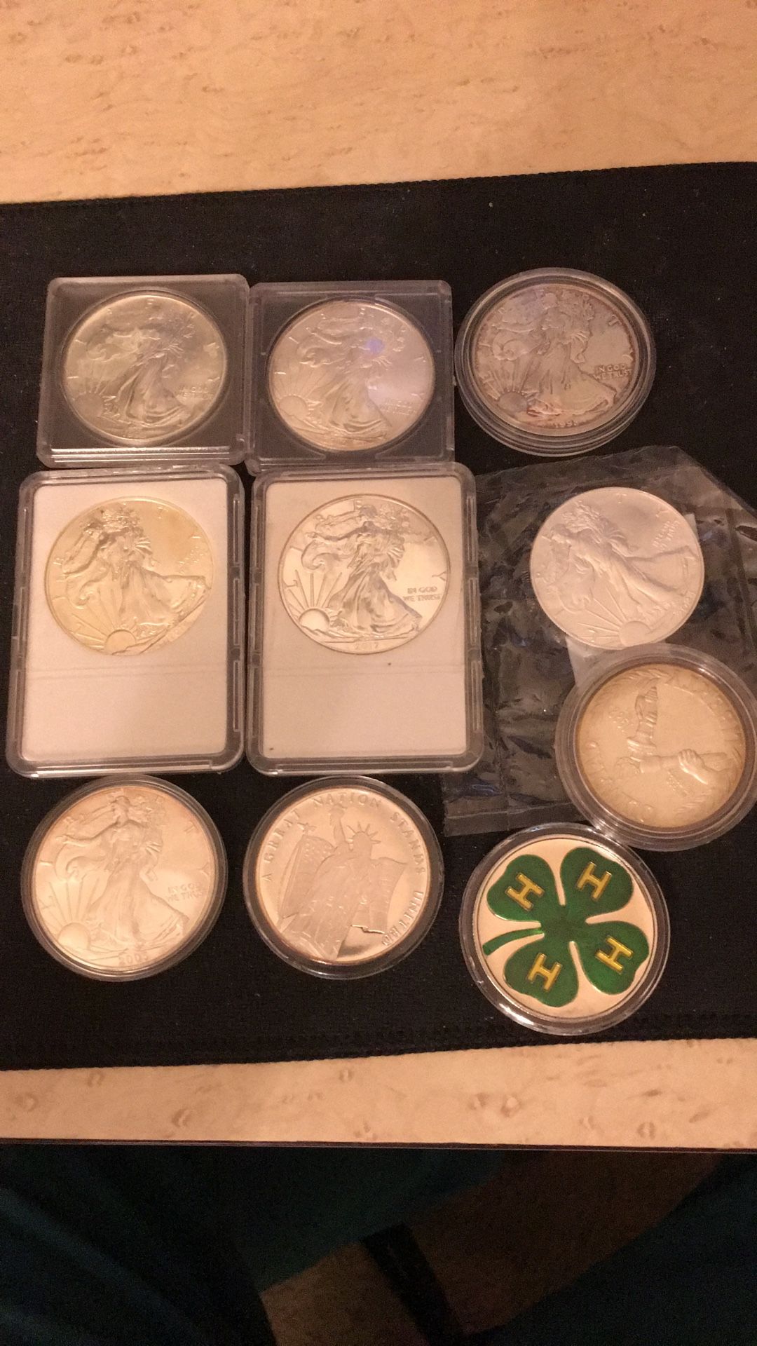 9.717 Oz. Silver——7 SILVER EAGLES——3 ROUNDS PICK UP IN CHINO Spot is $67.18—- I’M ASKING $72.50 ONE COIN ONLY .717oz. I’M NOT A COLLECTOR THIS WAS POINTED OUT T TO ME THIS MORNING BECAUSE OF MY MISTAKE IF YOU WANT YOU CAN BUY FIVE SILVER EAGLES AS A GROUP $375.00