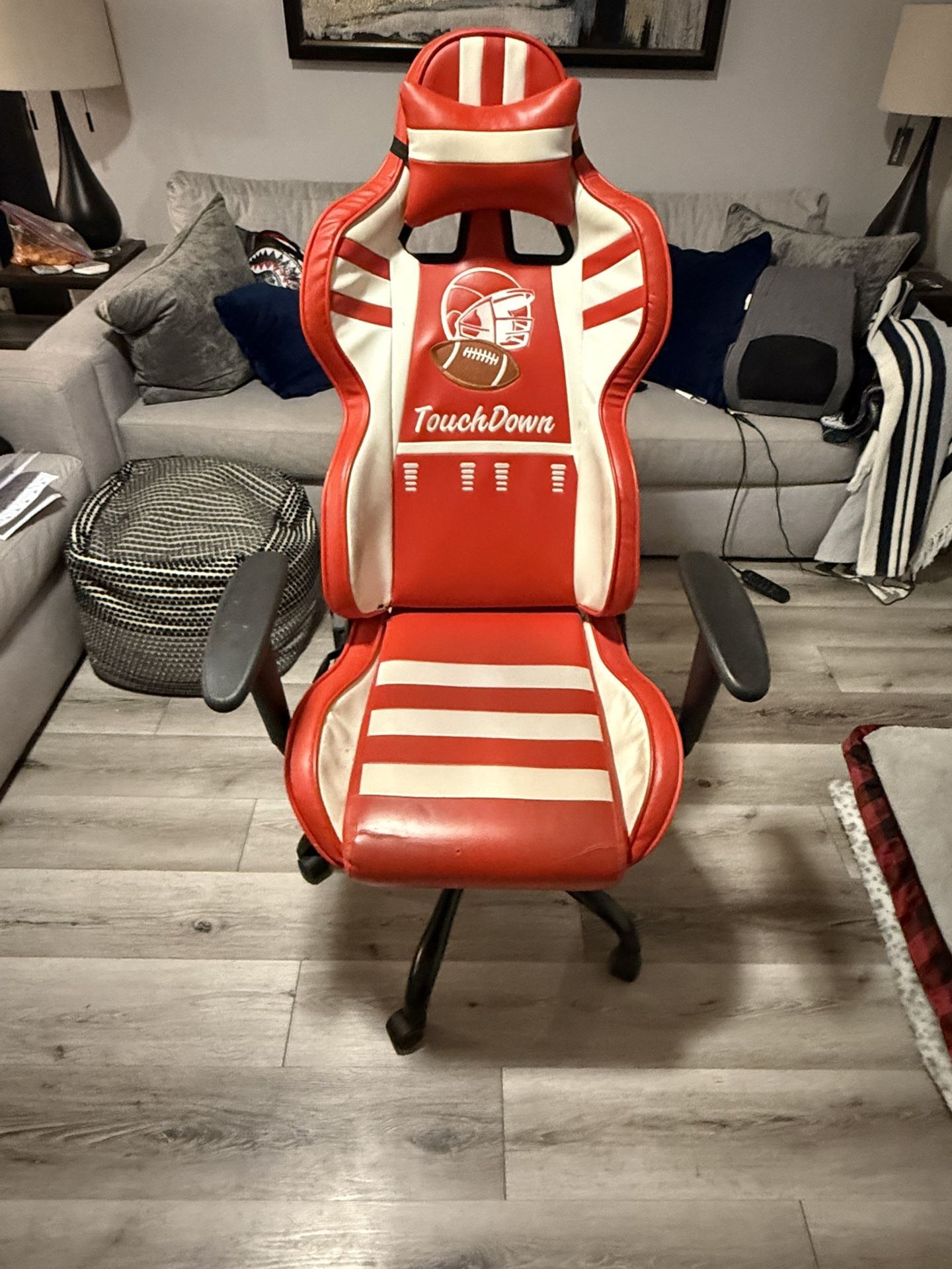 Red and white gaming chair with head rest.