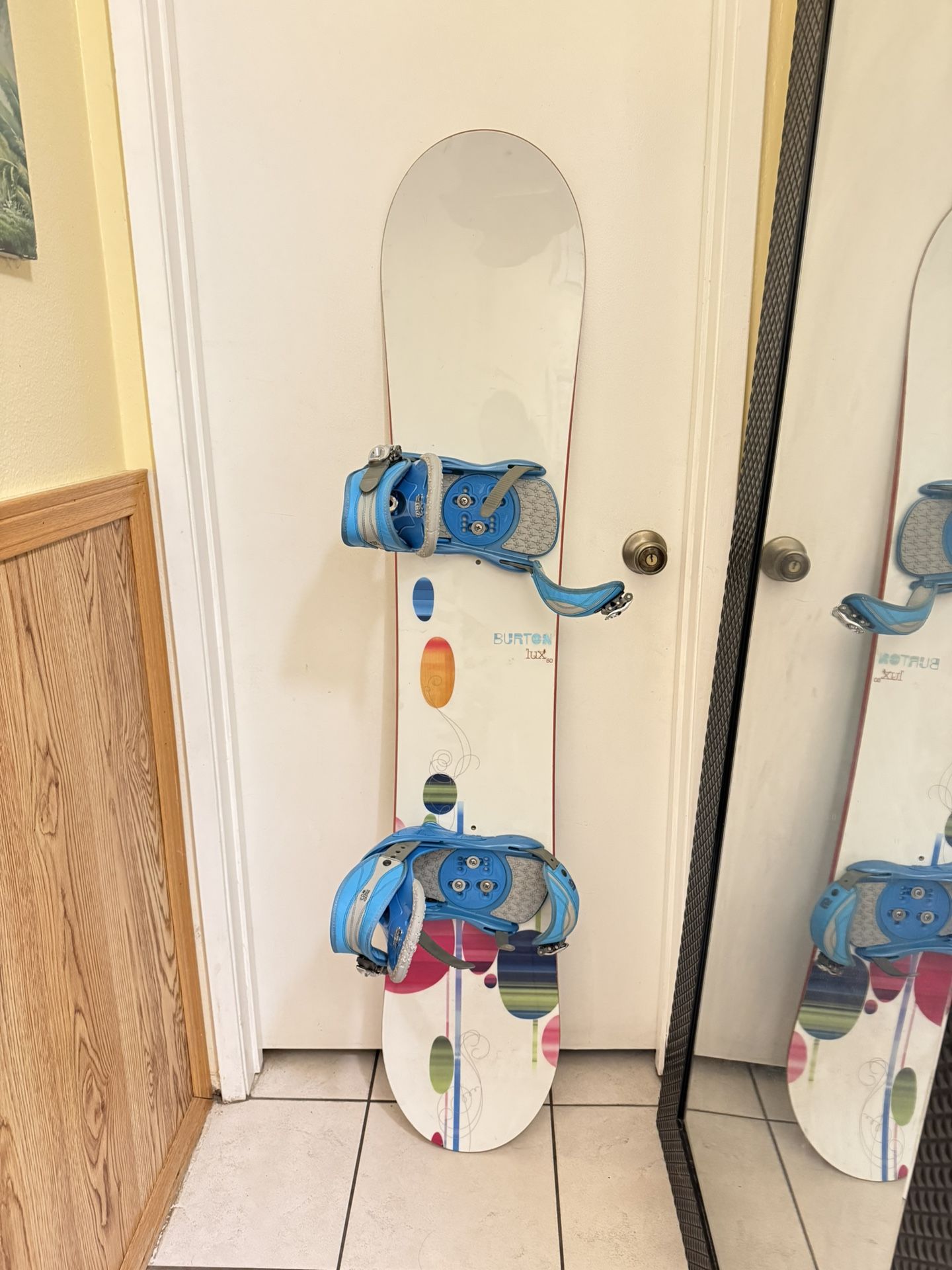 Burton 150 snowboard with fully functional Burton Lexa bindings *Bindings don’t seem to have an exact size marking shown, but measurements are shown in the pics (For reference, boot shown in pic is Size 7 Women’s) Barely used and in great condition with just a few barely visible scratches on the top sheet No chips or delamination Probably good board for riders about 120-170 lbs Pickup in Mira Mesa 92126 Feel free to ask any questions Check out profile for other snowboard listings 😄 Willing to work out discounts in exchange for: New quality brand skateboard decks size 8.0 in, Waterborne Surfskate Adapter Also have: miscellaneous snowboarding gear
