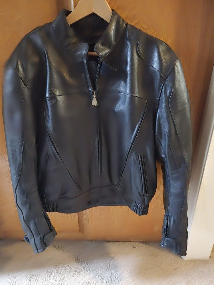 Hein Gericke, Large, premium leather Motorcycle Jacket, use with liner (or not). Excellent Condition, paid $450 new, a steal at $125. Meet in person (Ocean Beach, San Diego).