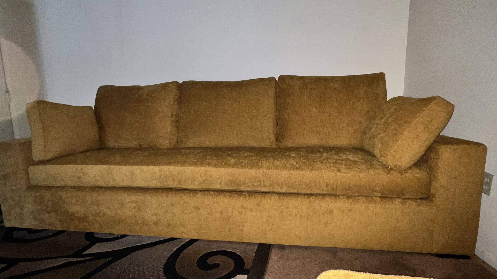 Brand New High Quality Custom Upholstered Sofa/couch/armchair/ottoman in a Mustard colored fabric with high quality custom inserts. Made with sturdy strong wood.
