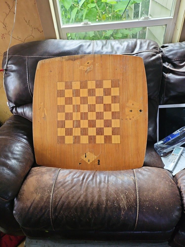It's a nice game table made in 40s or 50s it looks cracked but it's just the clear coat that has aged and easily removed and spray or brush new clear coat there recently has some darkening due to sitting on concrete in storage but alittke sanding and maybe bleaching dark area great project legs are in perfect condition solid table its a beautifully made game table inlay is great. Once clear coat is removed it will look great .if ask i can explain how to do it