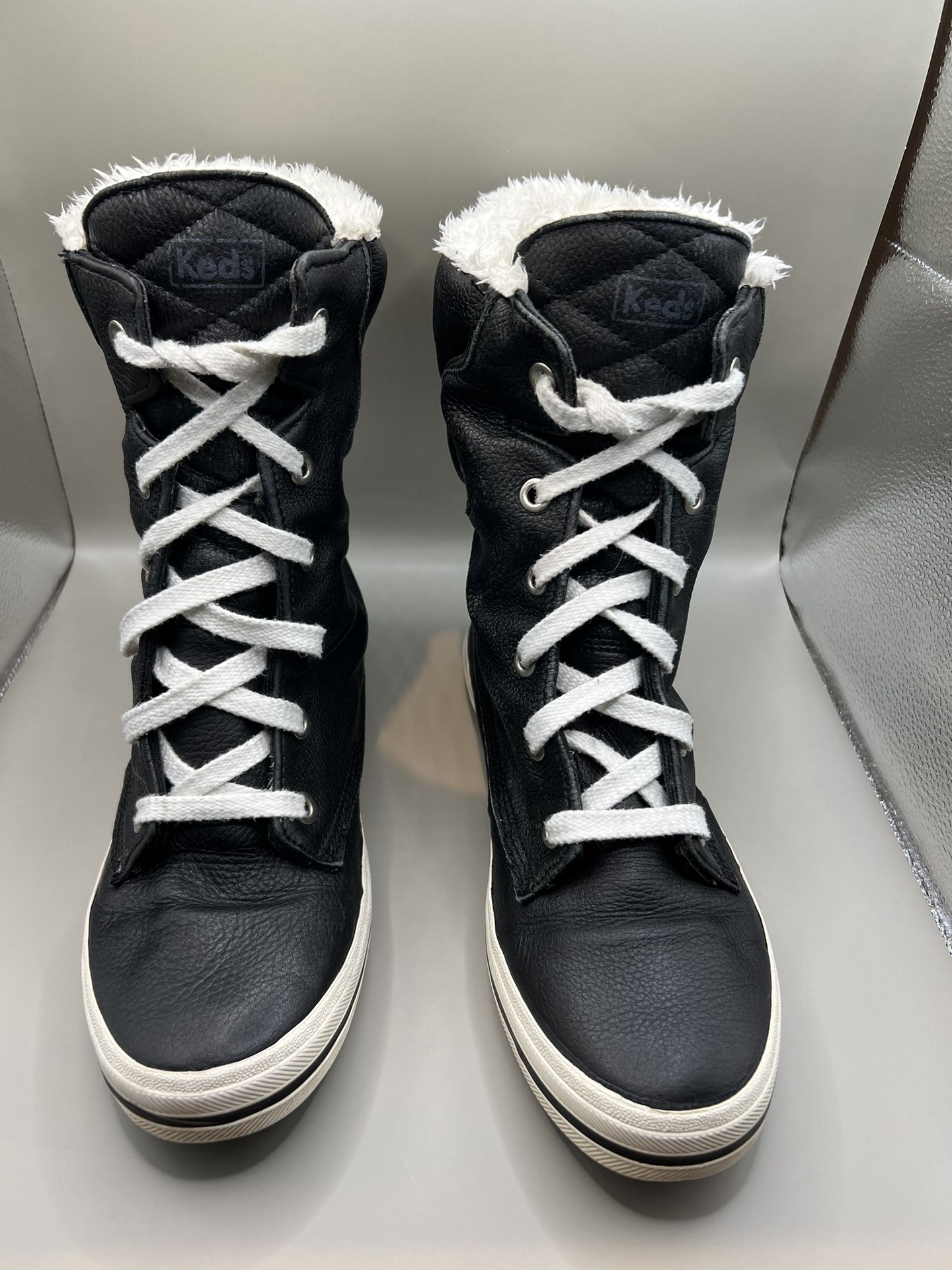 Black leather high top with shearling interior lace up sneaker. Warm, comfortable, clean