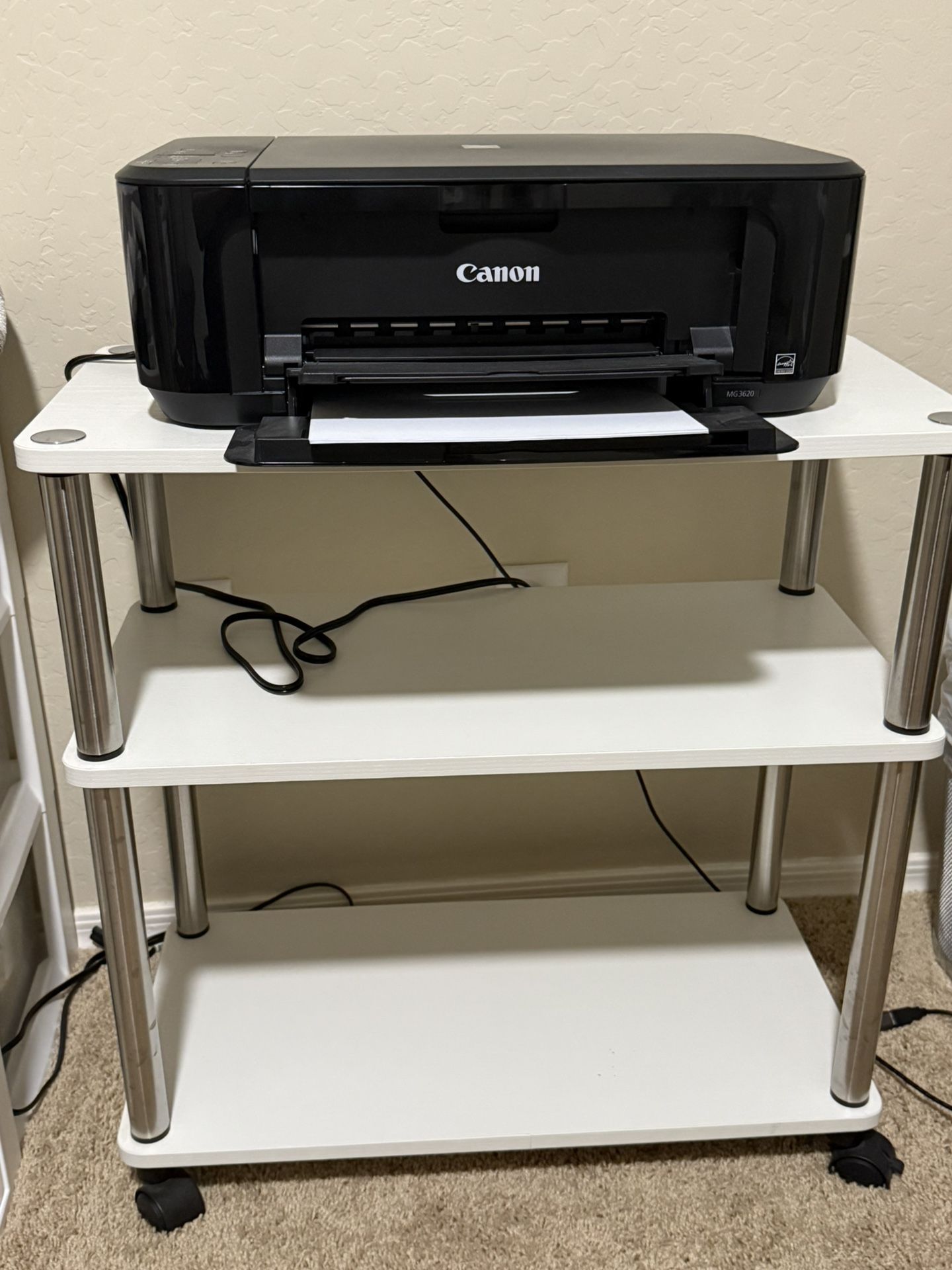 White rolling stand. Matches desk (also listed).