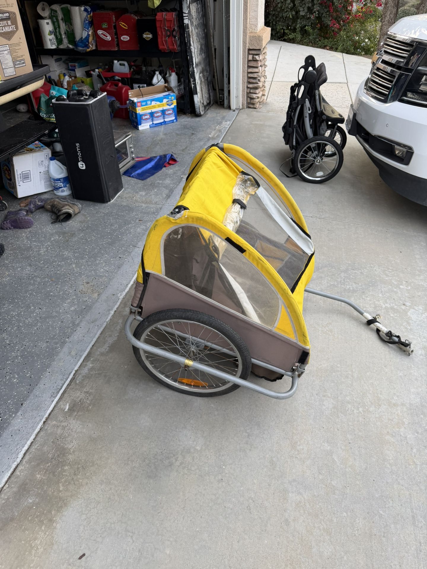 Bike trailer. Needs clean up. Also needs a$10 part to attach to your bike. My bike got stolen with that part on it. Works great though. Perfect for small kids. Can fit up to 3 kids depending on size. 2 kids is more comfortable.