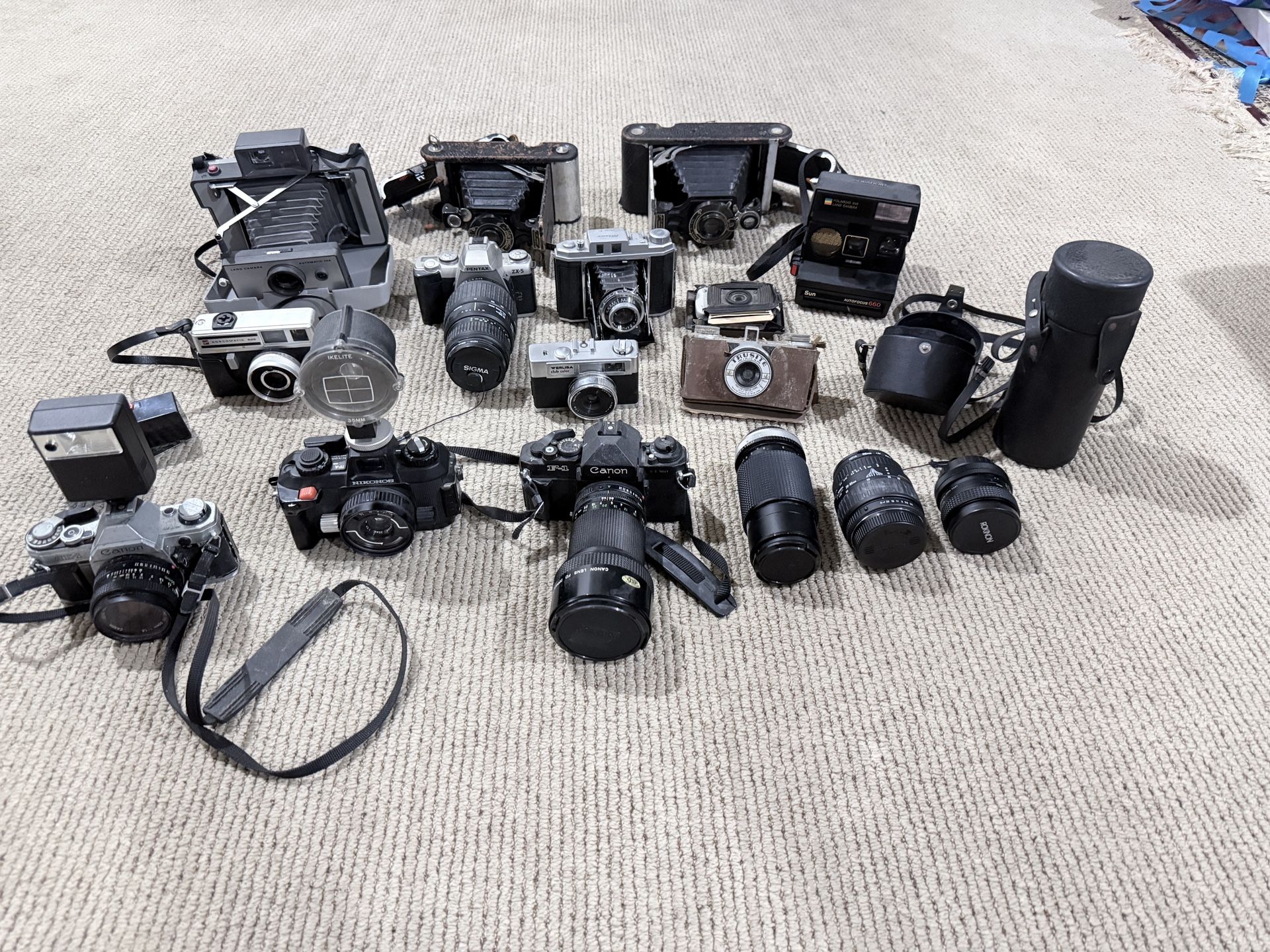 Vintage camera and accessory/lens collection, set as display and unsure of working condition but most have operable components. Selling as a full set but message me if interested in a specific one. Cameras included: -Canon AE-1 -Nikon IV-A -Canon F-1 -Pentax ZX-5 -Gaf Anscomatic 626 -Welisa club color -Trusite minicam -Mihama Model IIIA -Polaroid land camera model 808 -Polaroid land camera automatic 104 -Polaroid land camera 600 -Kodak No 1A autographic -Kodak No 2C autographic