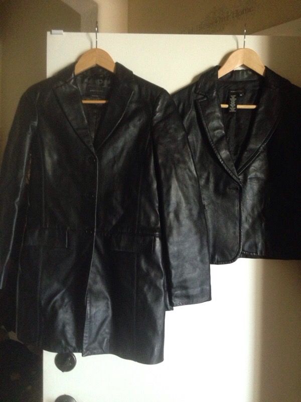 Leather BCBG jackets Size M Like new ! $100 the long one $65 the short one 100% leather Like brand new Never worn Size 4 The long one Goes just before your knees ( long) Retail price at BCBGmaxazria store $600 Let go for $100