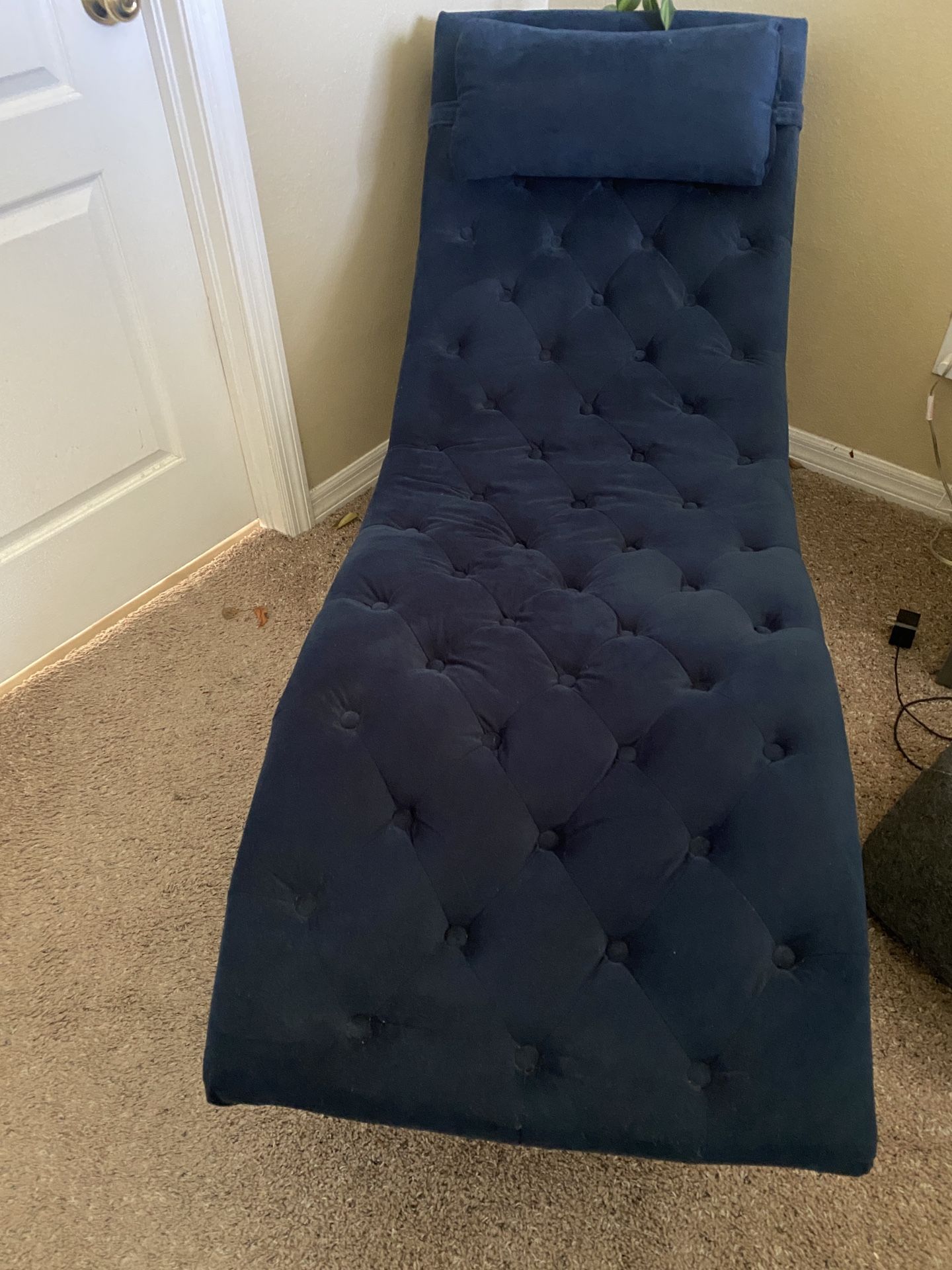 Stylish navy blue velvet tufted chaise lounge. Has super comfy feel with gold metal legs. Comes with a small matching pillow for extra comfort. Great for lounging around!