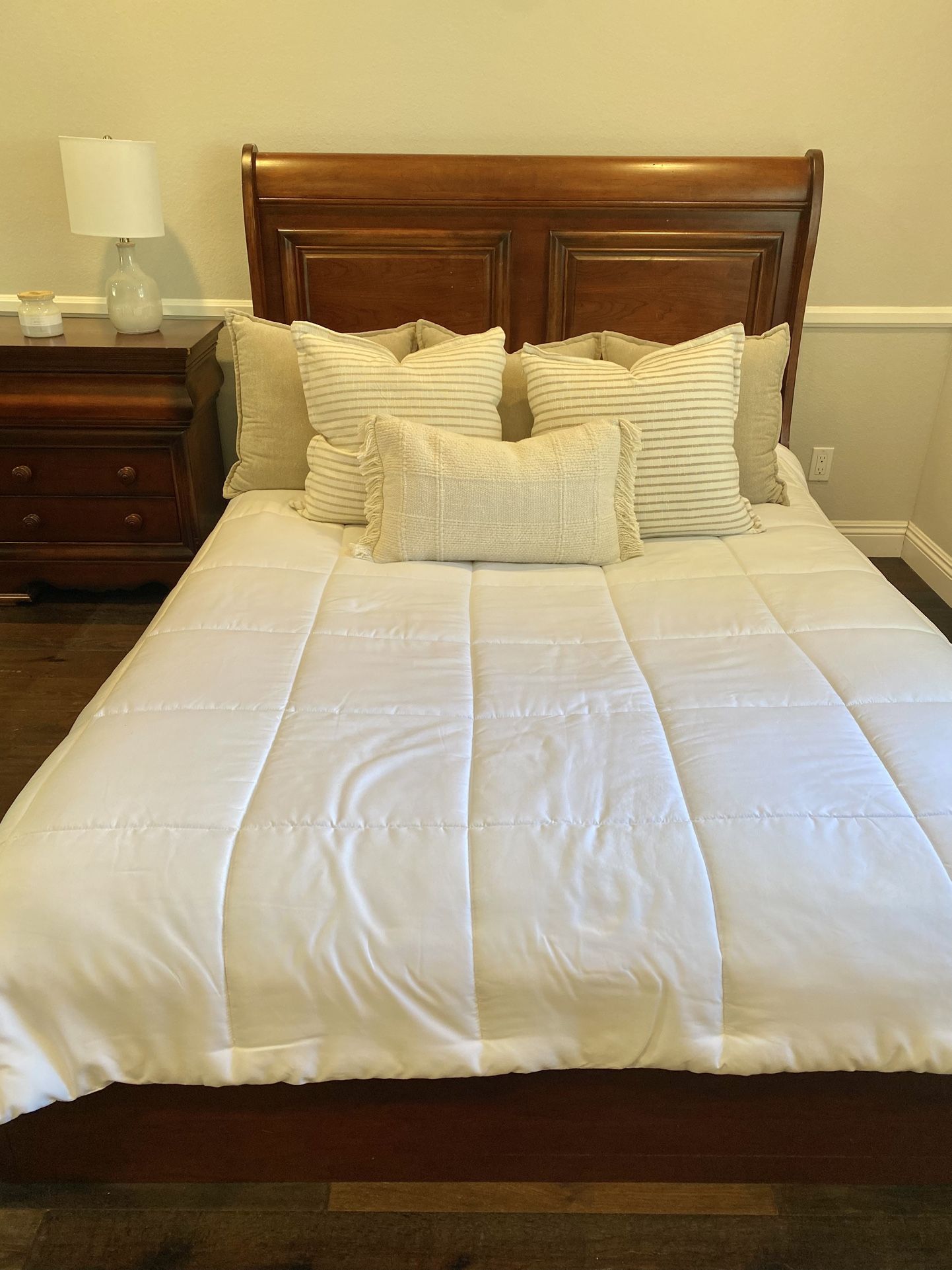 Matching set of bed frame, dresser and night stand. Super high quality, heavy, solid real wood set with a warm cherry finish and a vintage look. Measurements: Bed frame Headboard- 61in long x 50in tall Footboard- 72in long sides x 60in long face Nightstand 30in long x 16in wide x 31in tall Dresser 65in long x 18in wide x 41in tall Good condition with some nicks and wear as well as 1 drawer being broken but still in working function. Comes with an older mattress base and mattress if wanted. None of the decorations or bedding are included. Come check all of this out with no commitment or pressure of purchase. Will deliver if full price is paid and location is less than 20 minutes away, otherwise it can be delivered for an extra charge depending on distance. Full set starting price of $300, but individual pieces can be sold separately. I need it out so feel free to send your best offer and I’ll be going off of first come first serve. Again please come check it out with no pressure or commitment of purchase. 👍