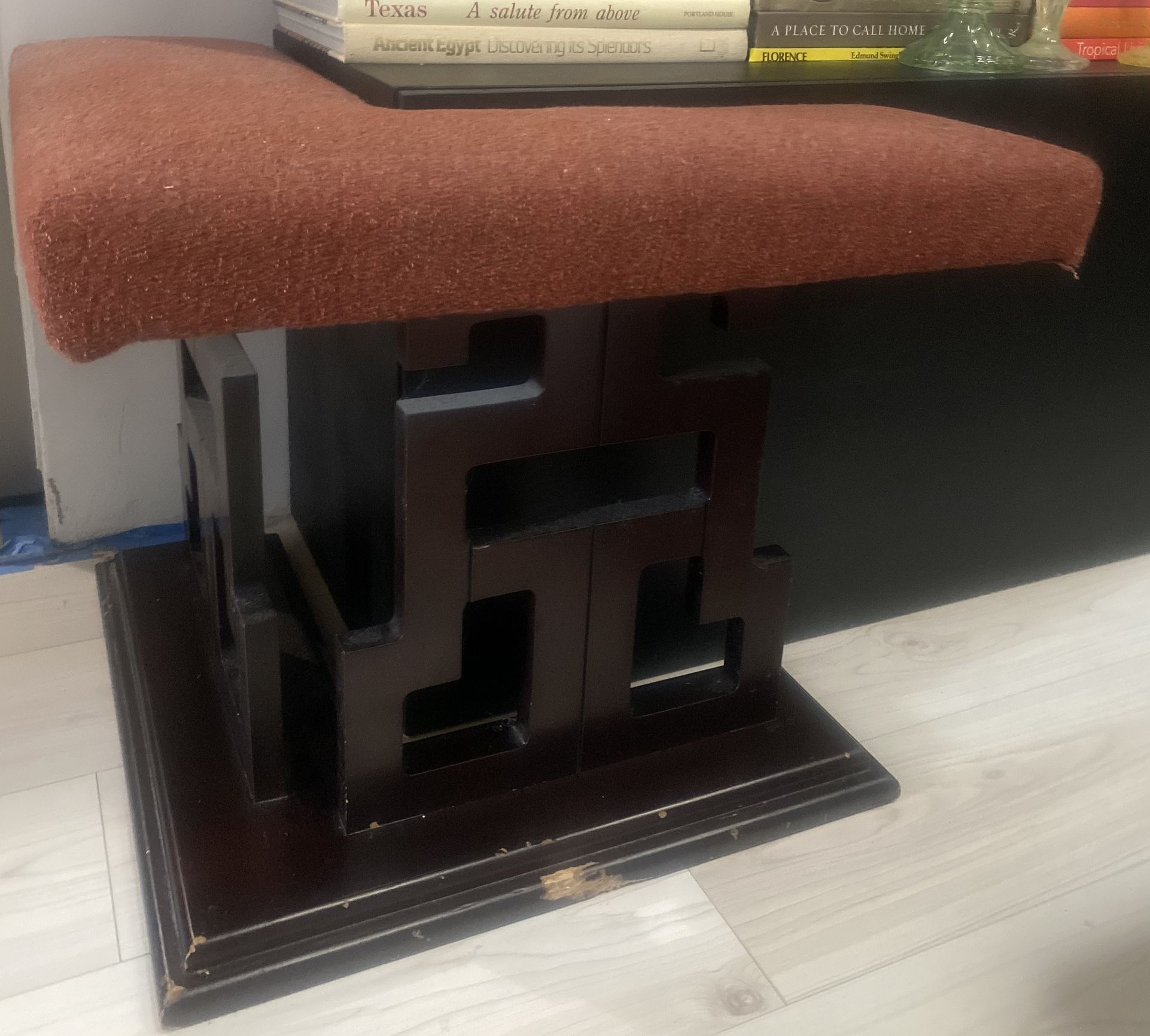 Left and right side corner benches with design. Benches have wear and tear towards the bottom foot area. 25x20.