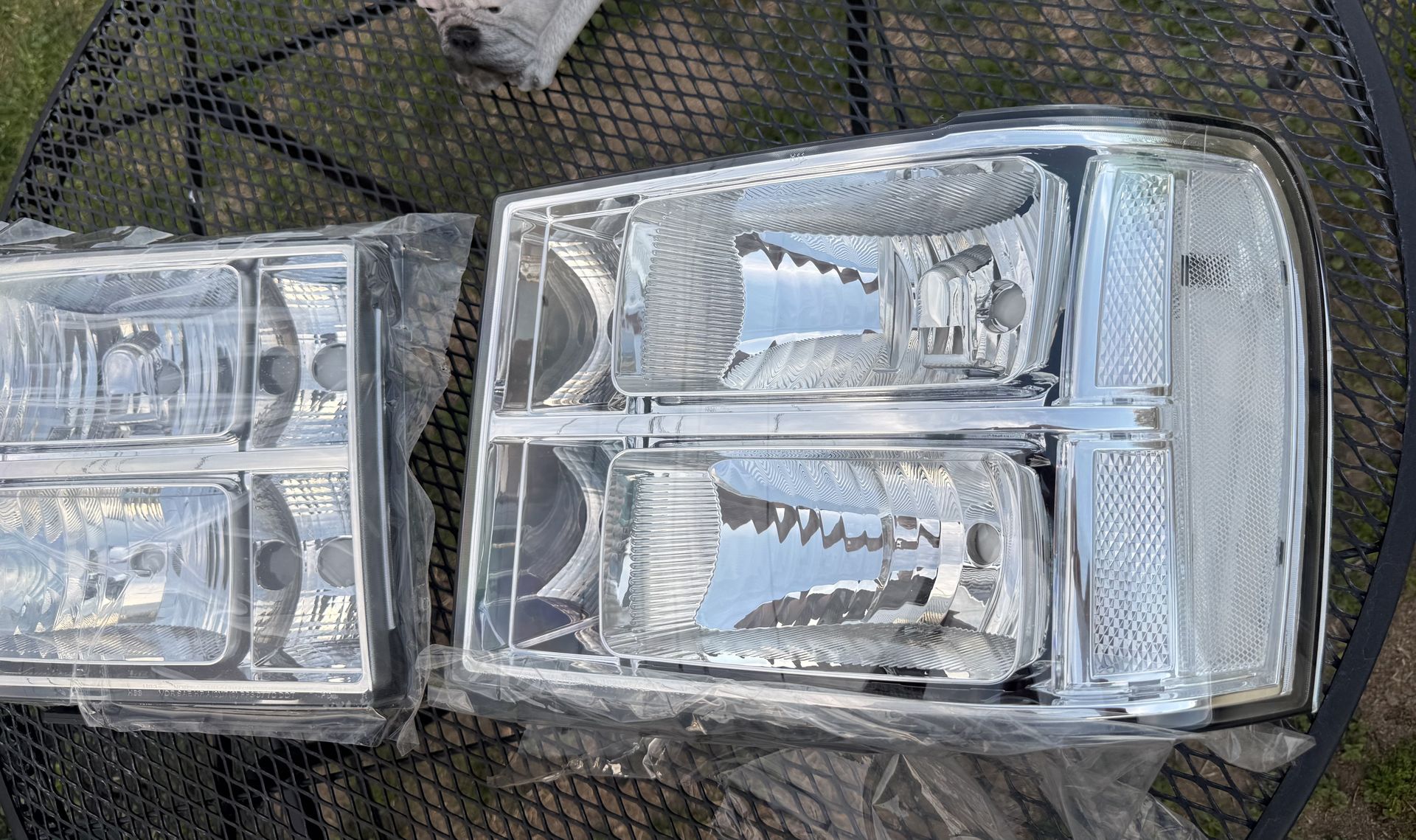 Pair of chrome housing, clear reflector headlights for 2007 to 2014 GMC Sierra models. New open box