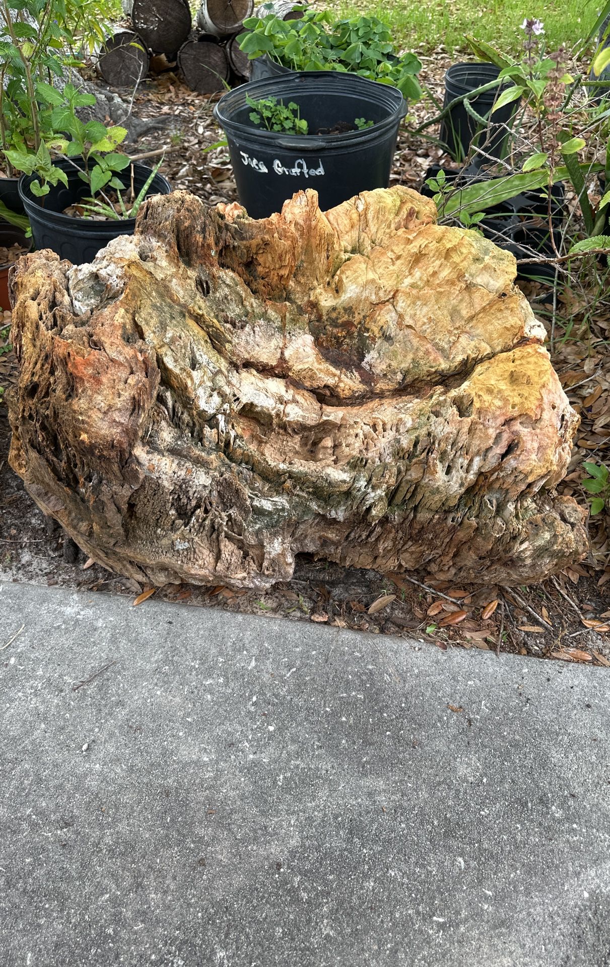 This is an incredible chunk of fossilized petrified wood, most likely the remnants of a stump. This could be tens to hundreds of thousands to millions of years old. See the Drooze! The smoky quartz oozing down the front. Imagine how long those crystals took to form! This is an incredible specimen, rare to be in Florida. It’s extremely heavy, 300+ lbs. Ask about delivery. Serious inquiries only please. This is authentic. I can offer free delivery.