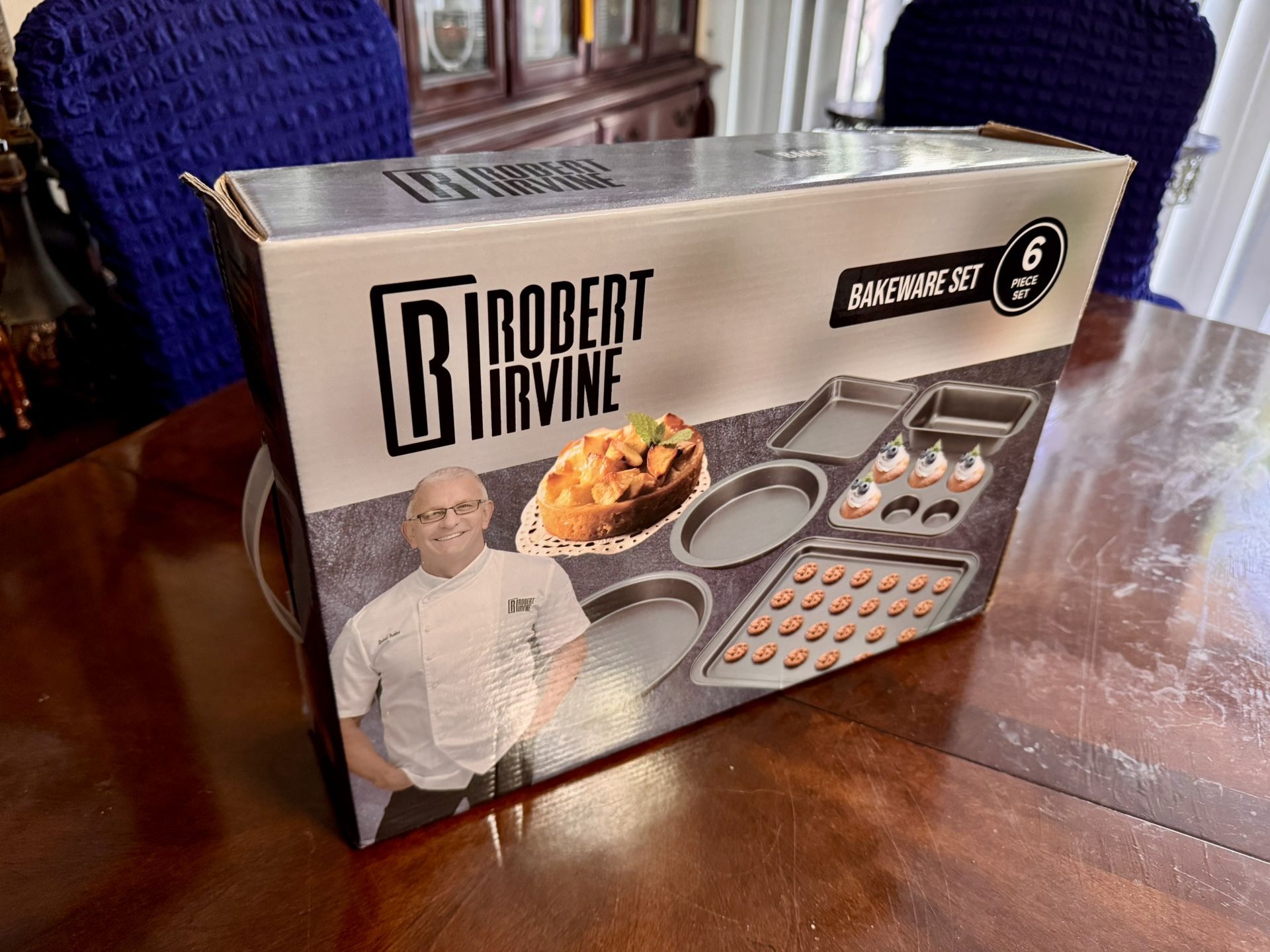 Robert Irvine 6-Piece Nonstick Bakeware Set, made of durable carbon steel. Product Details Set Includes: The six pieces in this bakeware set are a muffin pan, a loaf pan, a round cake pan (or pie dish), and a large cookie/jelly roll sheet, along with two other rectangular pans of varying sizes. Material: The pans are constructed from durable carbon steel with a non-stick coating for easy food release and cleanup. Features: They are designed to be used in an electric oven. Box Size (H/W/D): 11”x15.5”x4” inches
