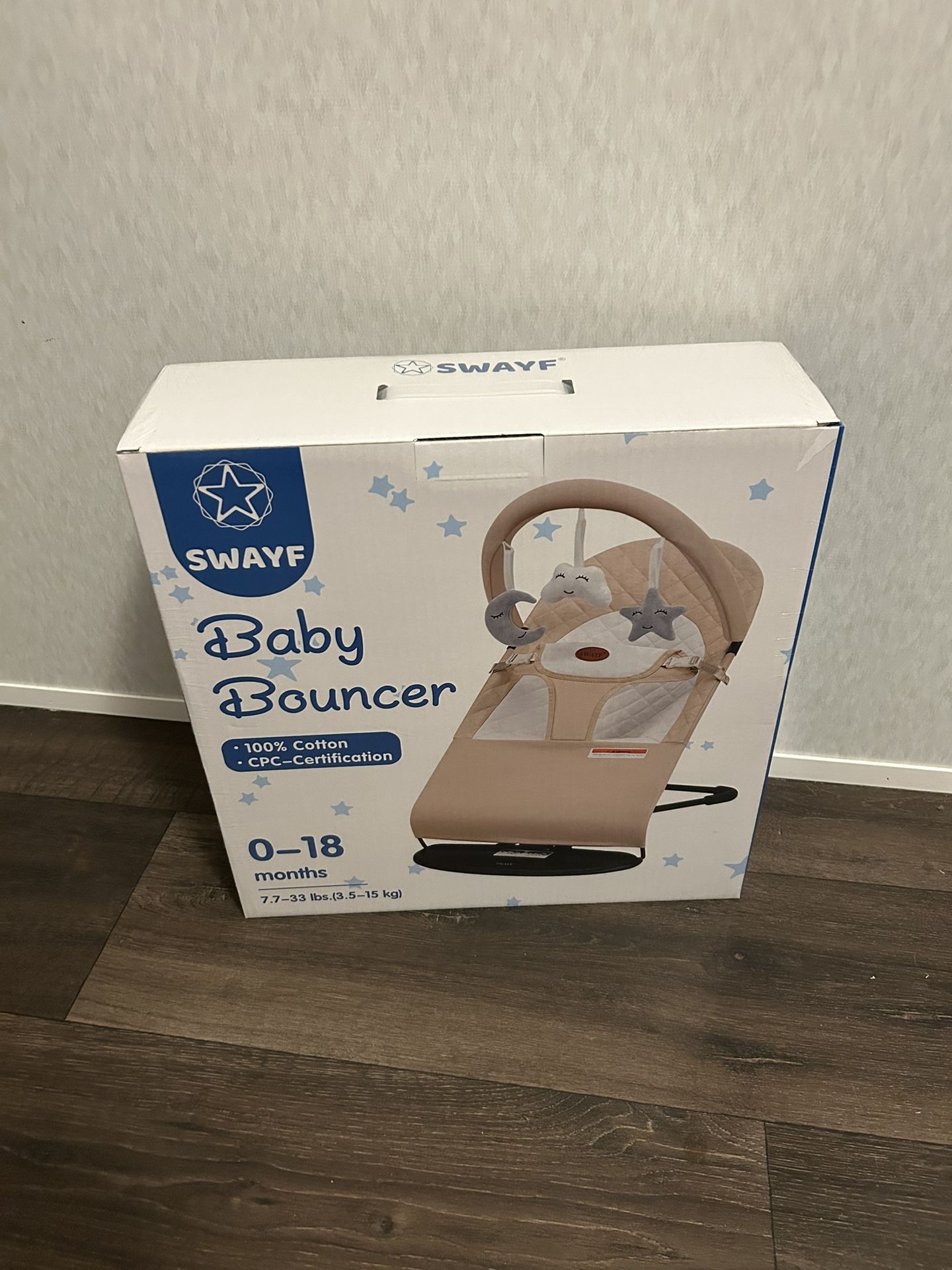 New, sealed SWAYF baby bouncer. Boxes are still plastic-wrapped; some outer shipping cartons may show a little dust/wear from storage, but the retail boxes inside look clean. All units appear to be the same neutral beige/tan color. 🌙 Key Details: • SWAYF Baby Bouncer, model HSX-001 • Age range: 0–18 months, weight 7.7–33 lbs (3.5–15 kg) • Soft 100% cotton fabric with quilted seat • Neutral beige/tan color with hanging moon, cloud, and star toys • Folds for storage/transport; lightweight and easy to move • CPC-certification noted on the box • Great for keeping baby close while you cook, relax, or work 💵 Price: • $35 (or best offer) • 70 units available – all appear to be the same color. • Open to reasonable offers, especially if you buy multiples (daycare, nursery, baby-shower gifts, etc.). 🏡 Pickup Info: • Home pickup in Louisville, TN (near the Louisville Post Office for reference) • Weekdays: 9 AM – 7 PM • Weekends: Pickup by appointment • Delivery/shipping may be available at buyer’s expense for multiple units or longer distances—message to discuss options. 🛒 Other Listings & Bundles: • Check out my other listings to save a trip and get a bundle discount – I usually have a variety of items for sale. ✅ Availability & Holds: • If this post is up, it’s still available. • Holds are only honored with a Venmo/Cash App deposit. • Full-price offers take priority over lower offers unless a deposit has already been made. 🔁 Testing / Returns: • These are new in sealed boxes. You’re welcome to inspect the box at pickup, and if you’d like to open one before paying we can arrange that. • Refunds are only offered if an item is not functional as described, and any return must be agreed on at the time of purchase or shortly after pickup.