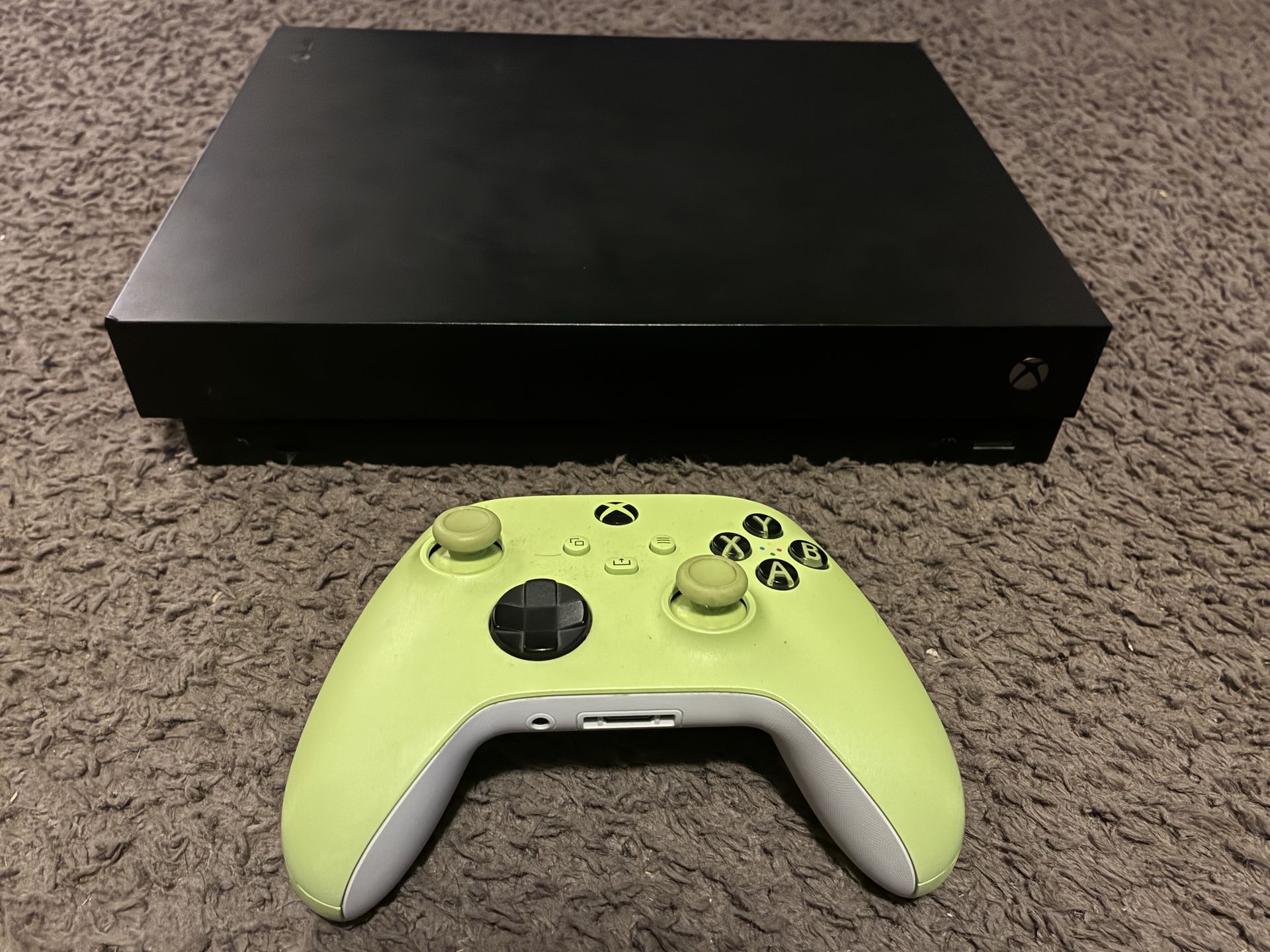 Microsoft Xbox One X 780 GB of storage Tested, works perfectly, no issues Used, like new Comes with: Green controller (minor stick drift in left stick), Power cable, and Call of Duty: Black Ops 4