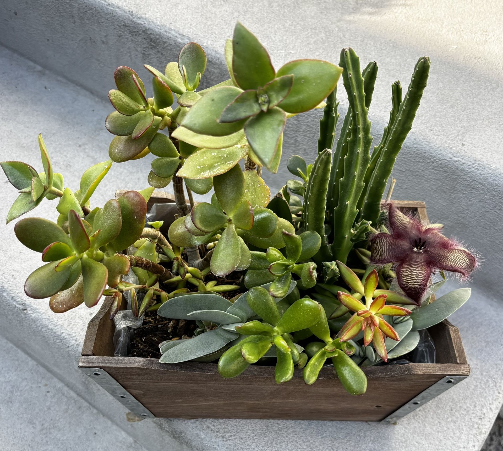 Nice Arrangement Of Different Small Succulents Including A Stapelia Star Fish In Small Wooden Box Asking $10.00