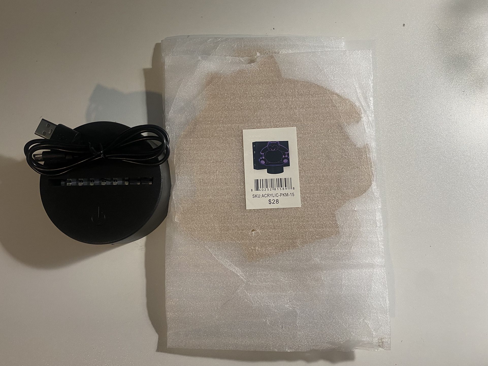 New With No Box Pokémon LED Display Set. Comes with a acrylic design of your choice (see picture) Base and power cord It has 3 setting with the tap of one button -brown protected film must be taken off to use