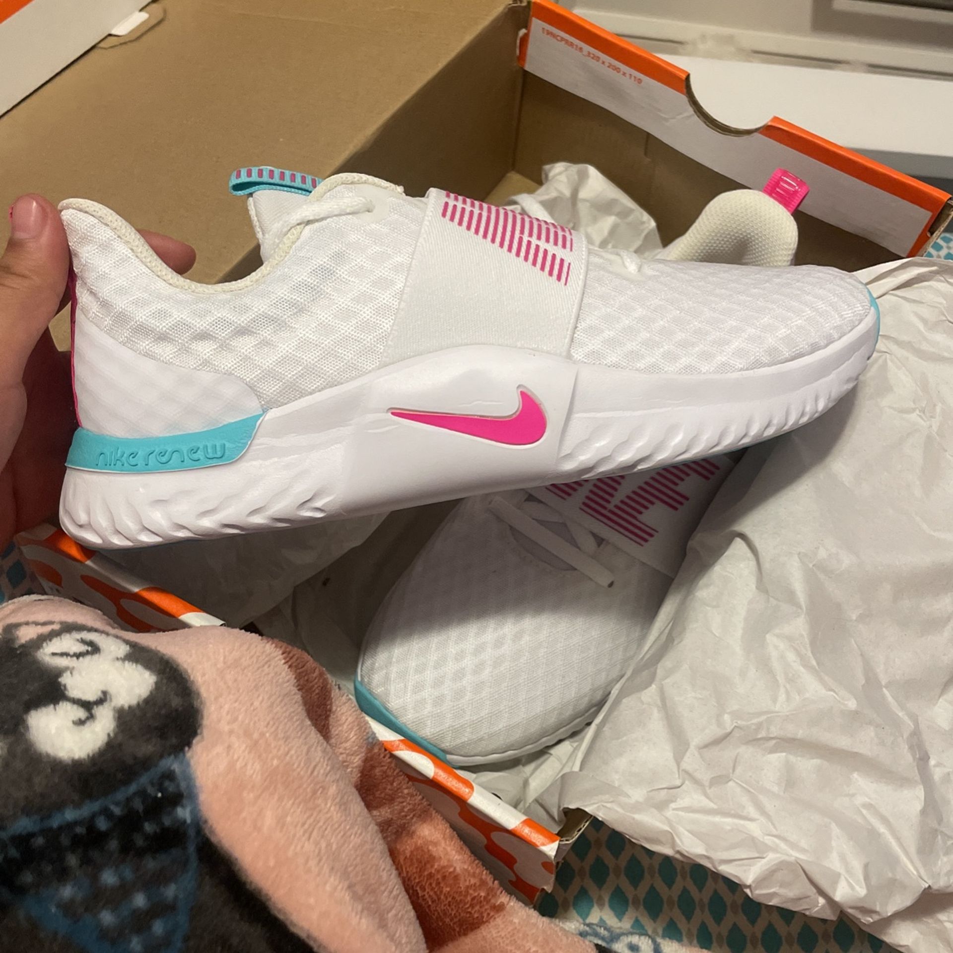 These are brand new Nike Renew In-Season TR 9 Shoes. The colors are, White/Pink Blast-aurora Green