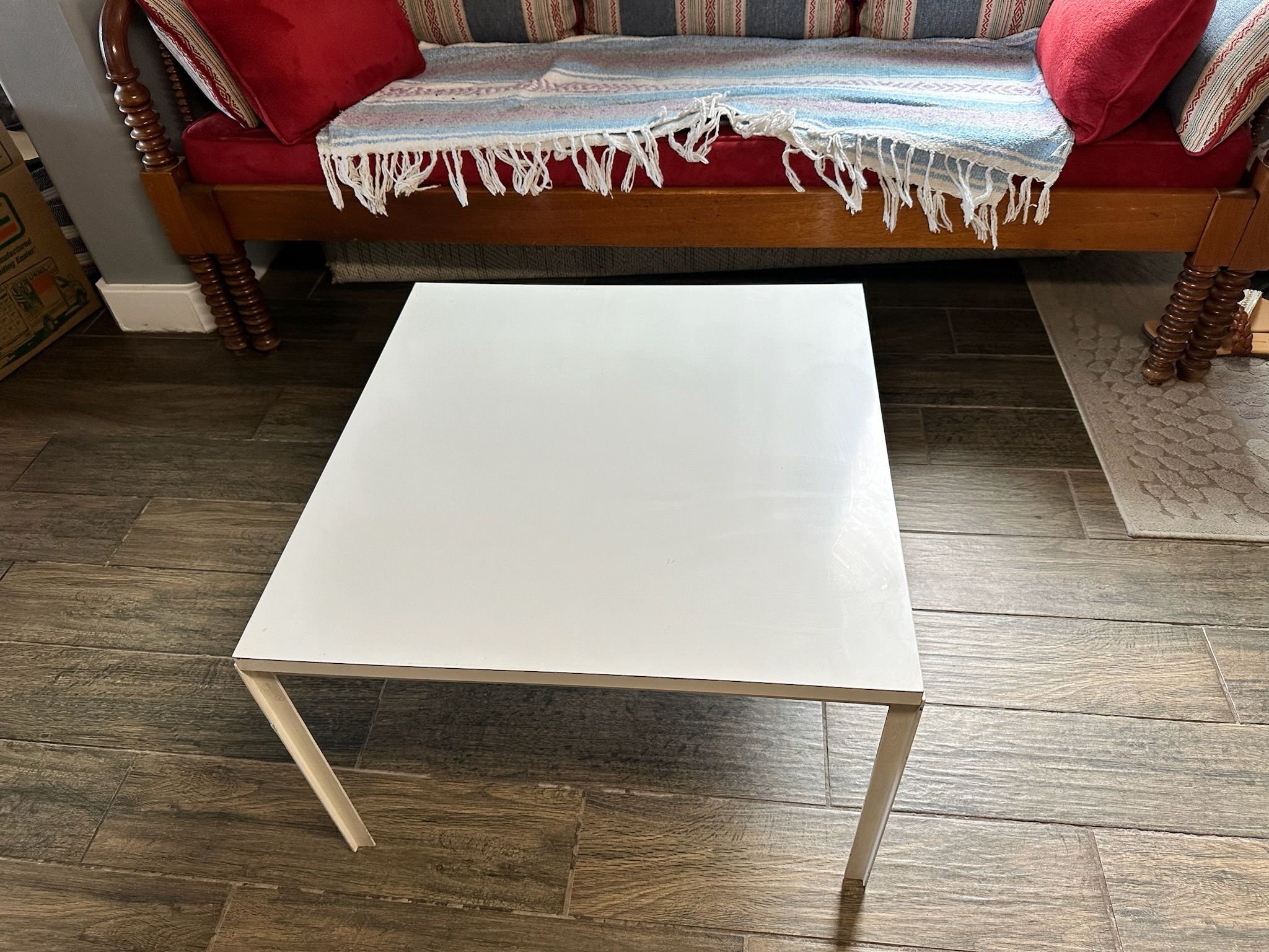 This is a mid century modern Florence Knoll square coffee table circa 1960 era with white laminate top on top of an iron base. The table has normal wear and tear but is in overall good condition. The label is no longer present from Knoll Associates, inc but the item was verified via a local MCM dealer. Dimensions are 24” W x 24” D x 16” T. Pickup is available in Tucson AZ, just send a message.