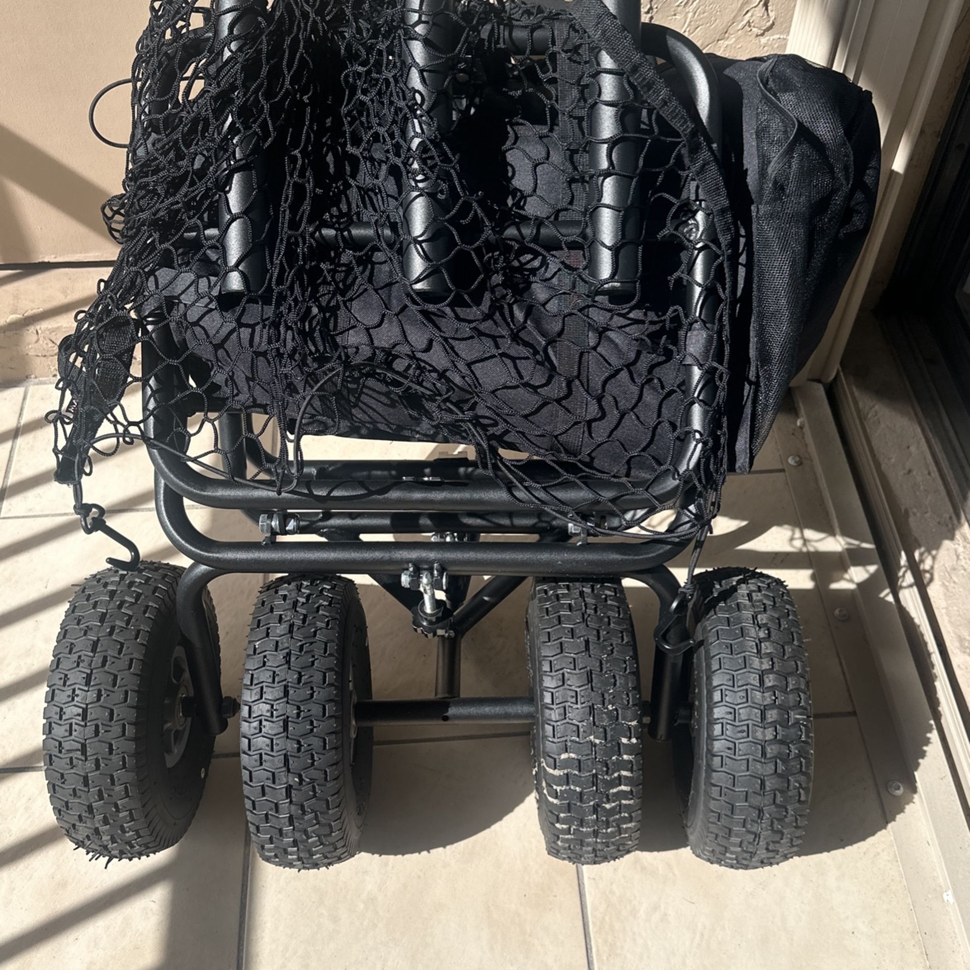 This beach and fishing car comes with big wheels for sand also on sides have fishing pols holders 6 of them . The beach car comes with a net to hold your chairs and cooler that is not include also comes with 4 spare wheels ( spare wheels are extra $50) .