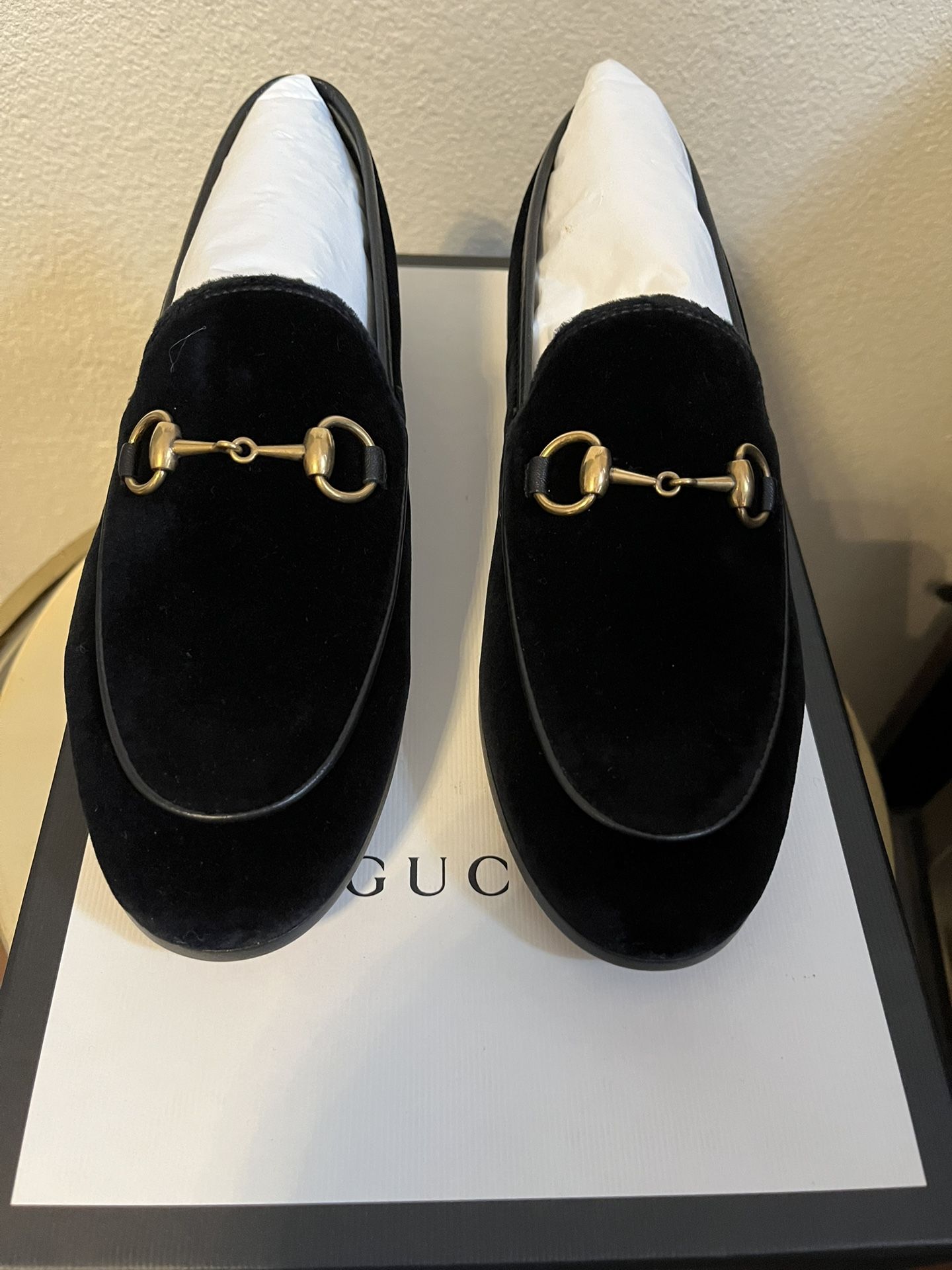 Gucci Jordaan Velvet Suede Loafers, Authentic New , Size 5.5 Unisex, Come With Box and Dust Bag , Gucci "Jordaan" suede loafers 0.50 in / 15 mm flat heel Round apron toe Gold-toned horsebit hardware Slip-on style Leather outsole Lining: Fabric Made in Italy ๐ฎ๐น , Retail Price $895 Plus Taxes, I was Brought in Gucci Stores