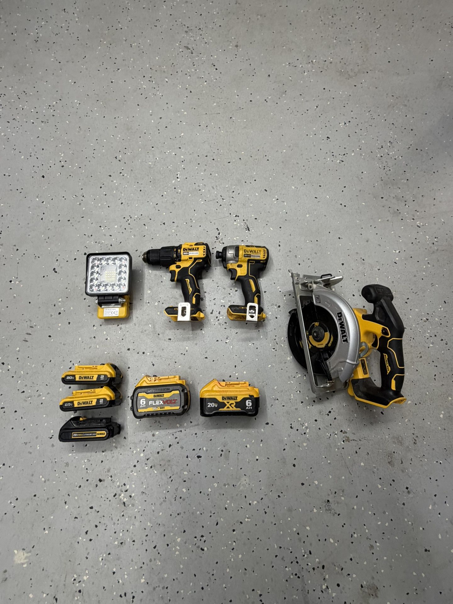 Comes with fast charger 3- 2ah batteries 1- 6ah flex volt 1- 6ah xr Impact driver Hammer drill- brand new never used Saw- used twice Light