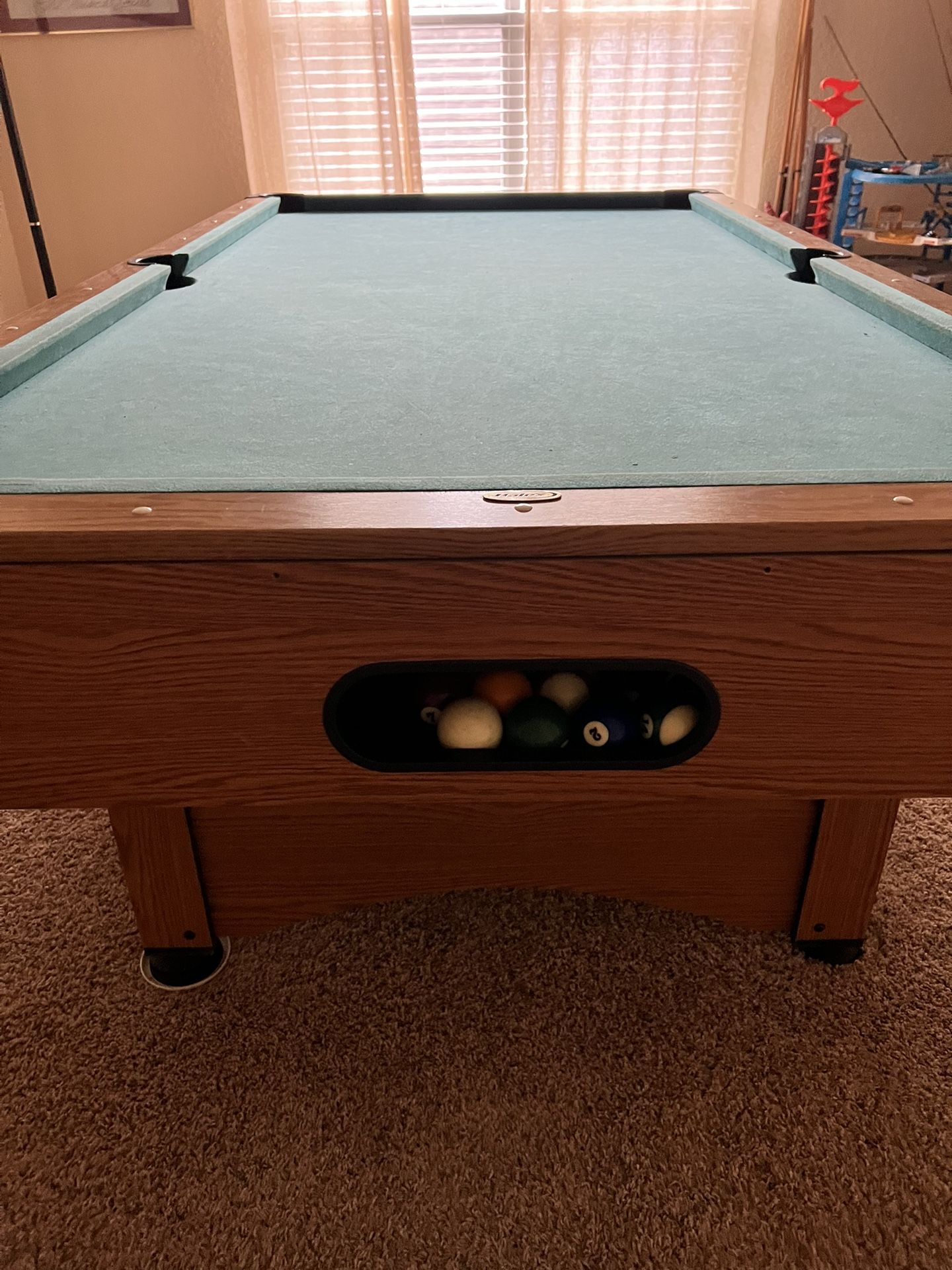 Pool table with pool sticks, & art. Must go today. Estate sale.