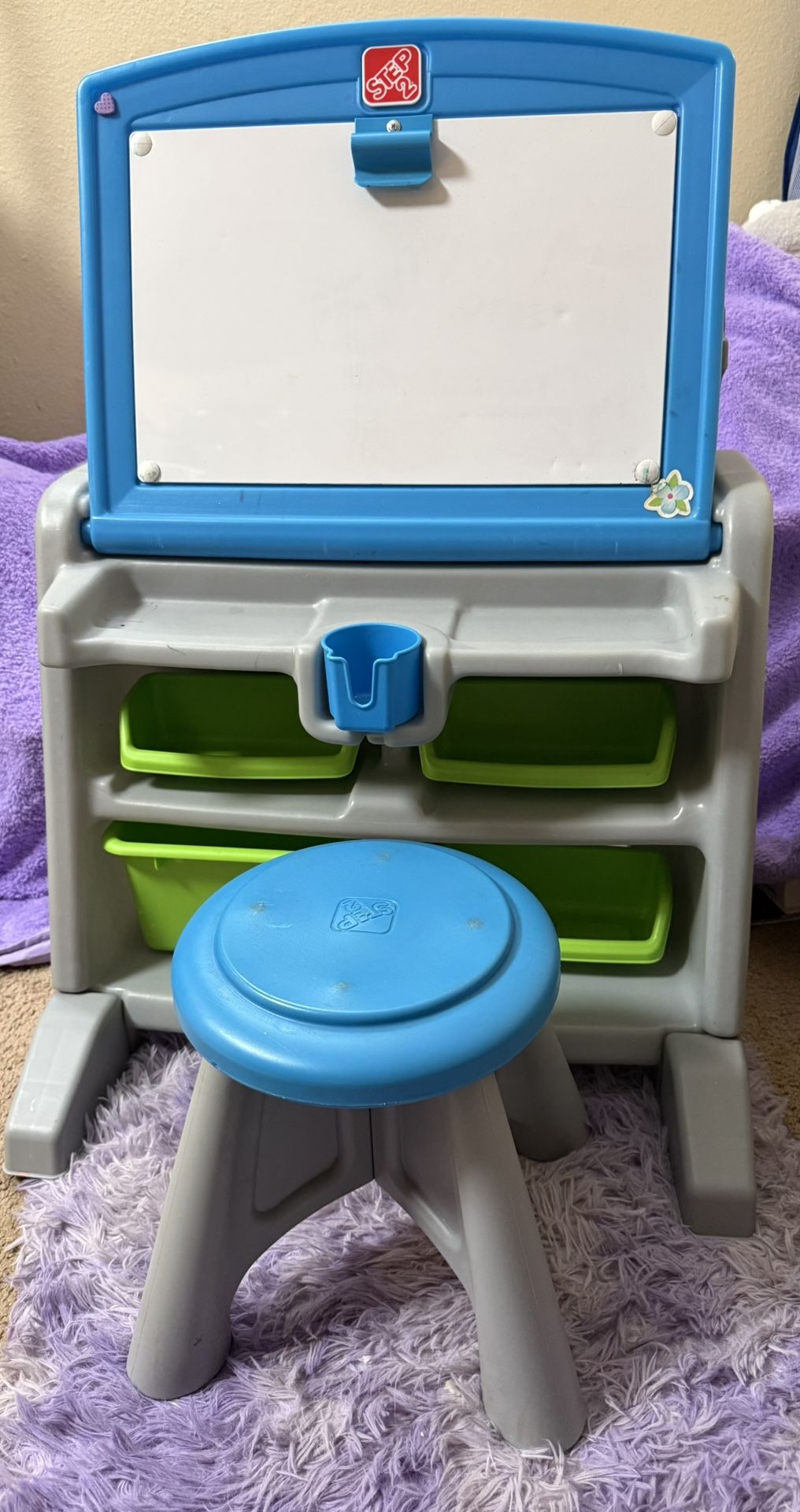 Child’s desk and easel combo with stool and storage bins.