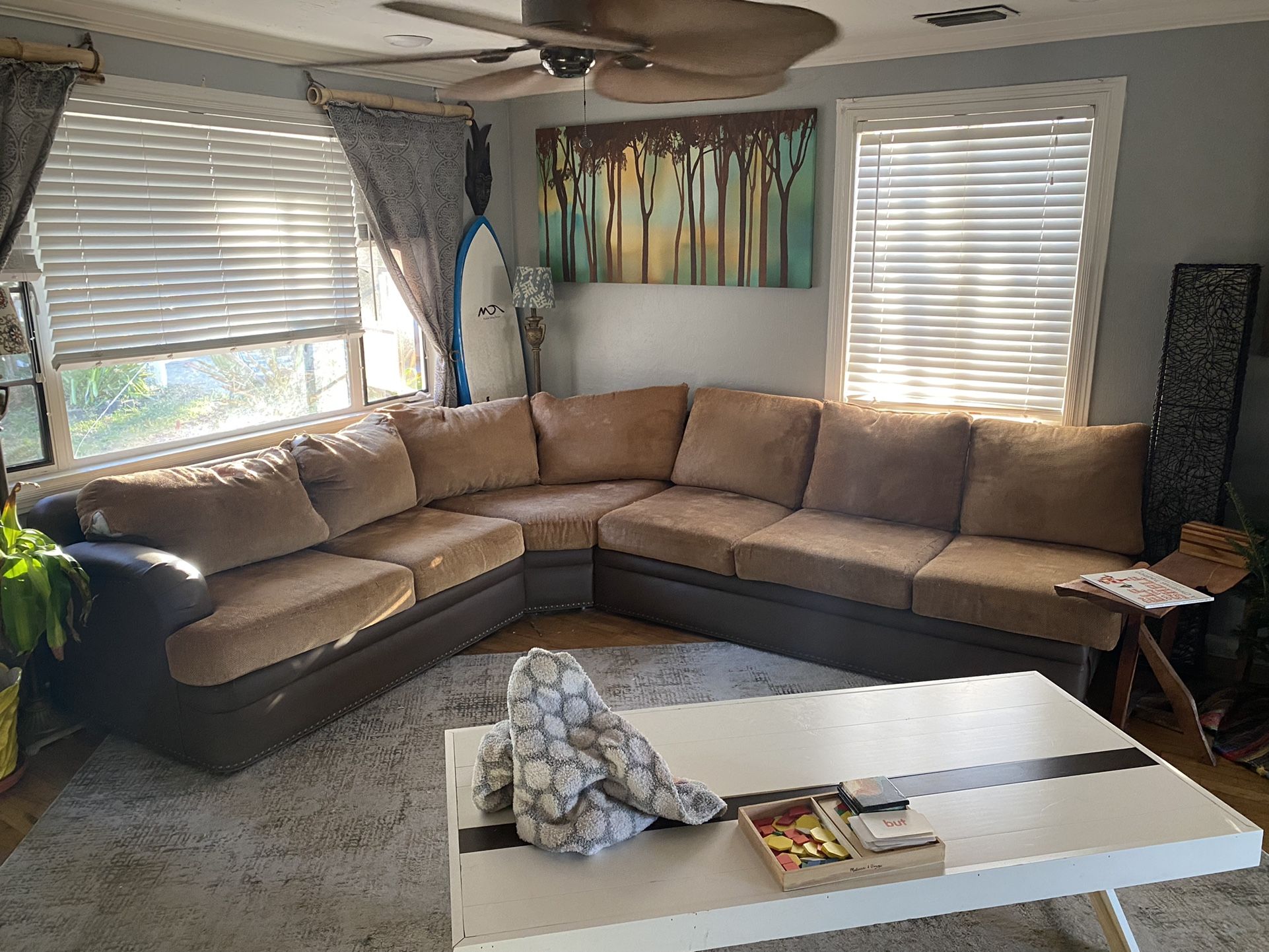 I bought this couch a couple years ago for 3500 and the leather is real and very nice. My dog chewed a couple of the cushions so will need to get new fabric put on them or covers but it’s also the reason why it’s so cheap
