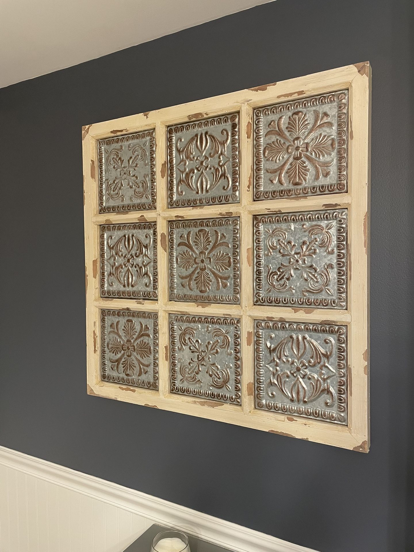 Beautiful antique tin and wood distressed picture. Purchased from Wayfair. Perfect condition. Smoke-free home.