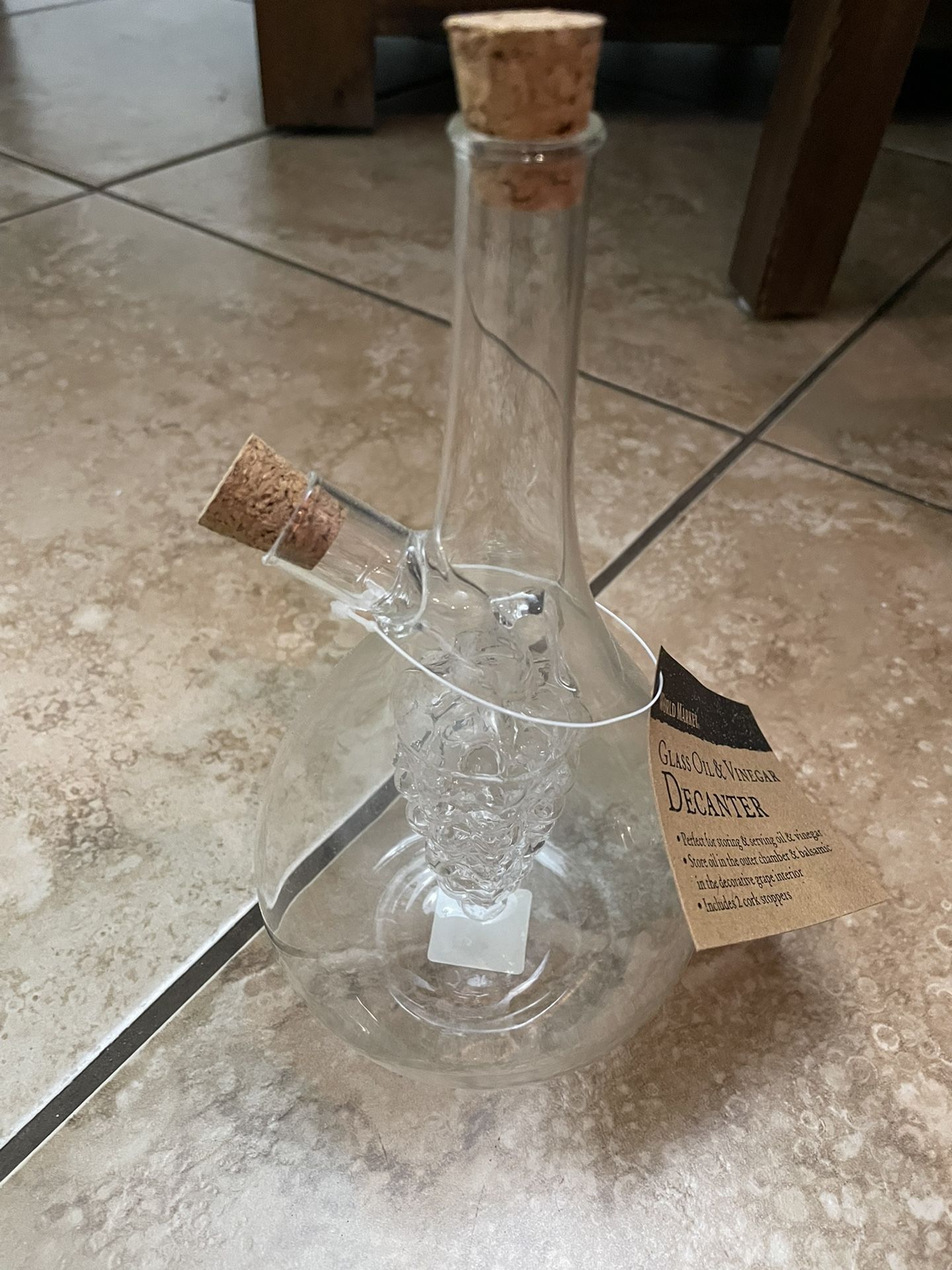- Elegant World Market glass oil and vinegar decanter - Inner glass compartment shaped like a cluster of grapes - Includes 2 cork stoppers - Never used
